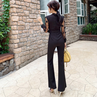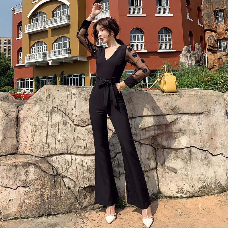 新款 连衣裤 欧洲站时尚 微喇长裤 女 气质显瘦网纱拼接高腰连体裤 夏装