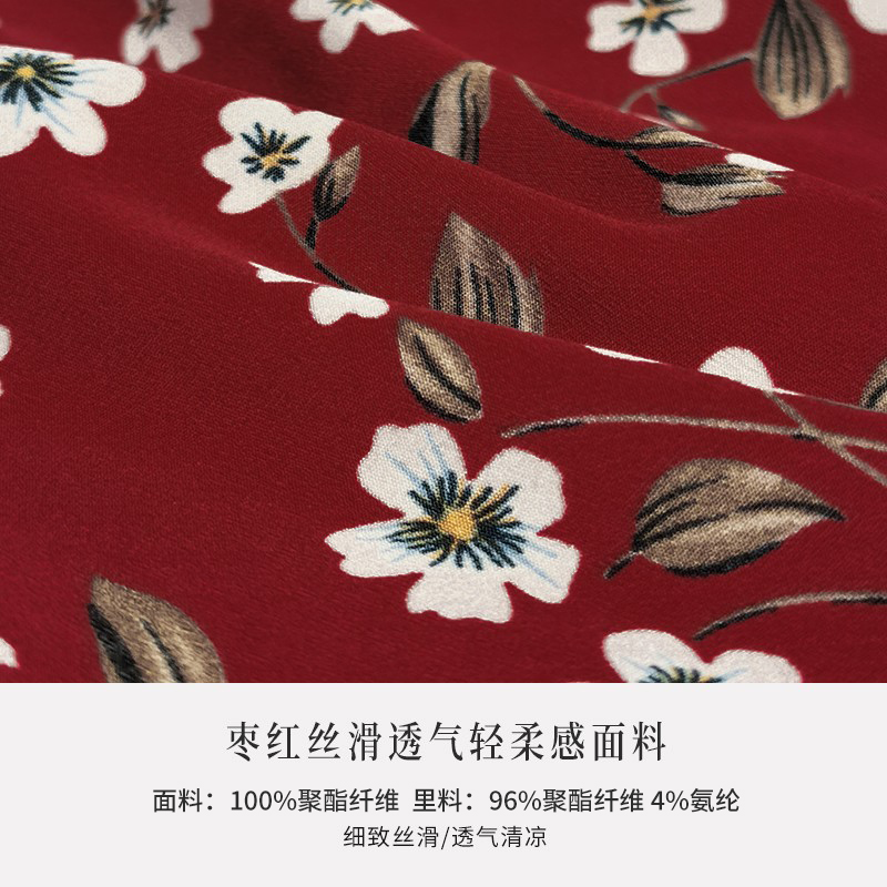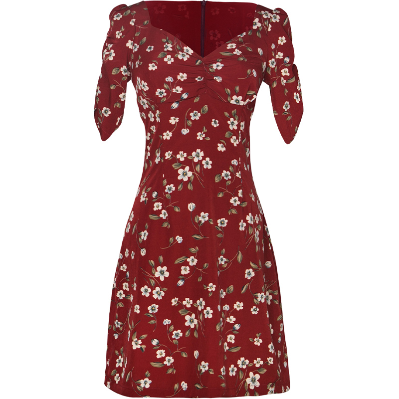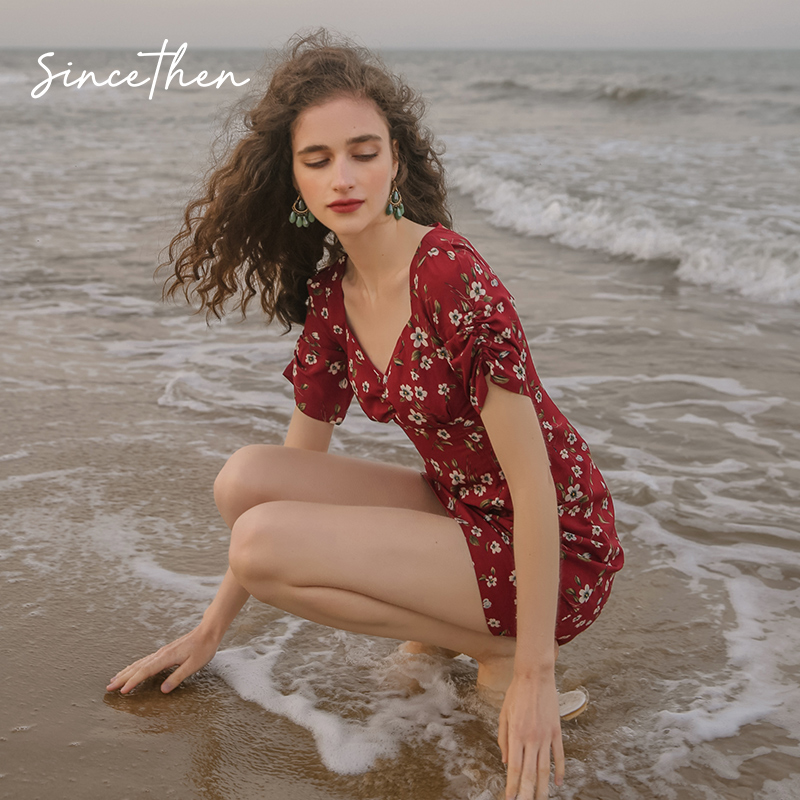 从那以后法式 花裙V领收腰裙女 红色复古碎花连衣裙高级感茶歇短款