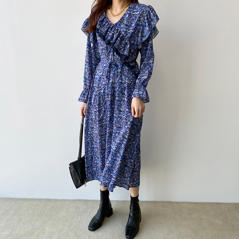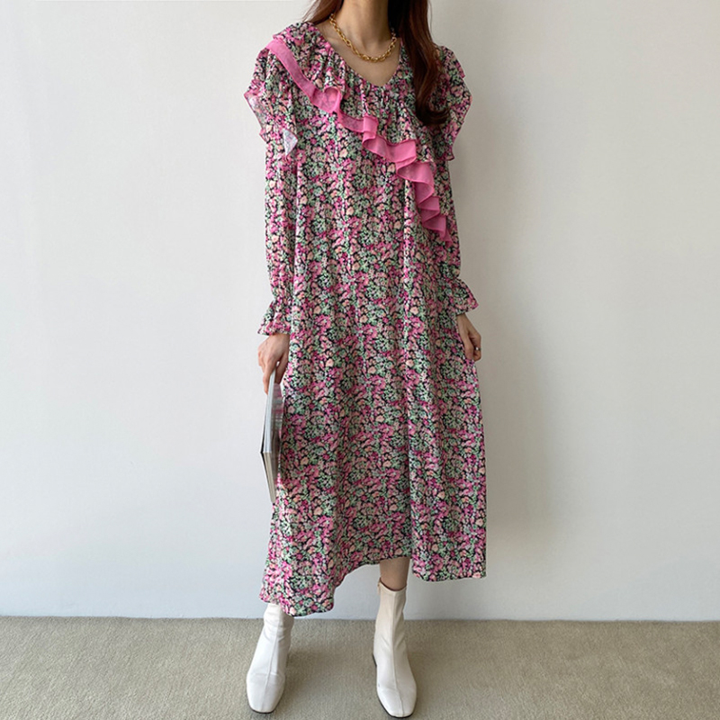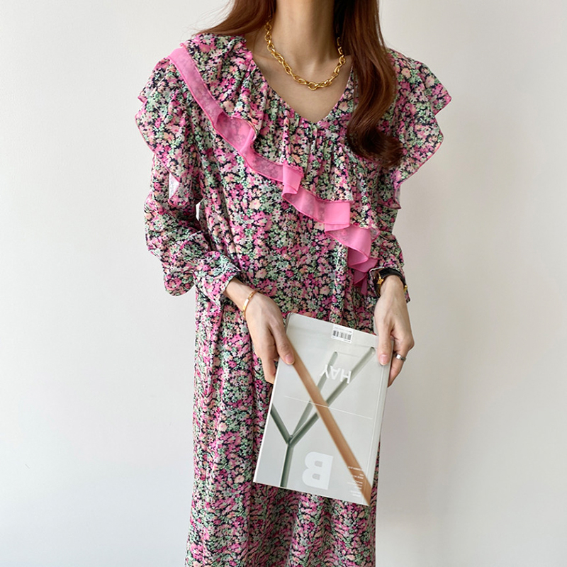 韩国chic洋气复古碎花v领不规则荷叶边拼接宽松长款 连衣裙 喇叭袖