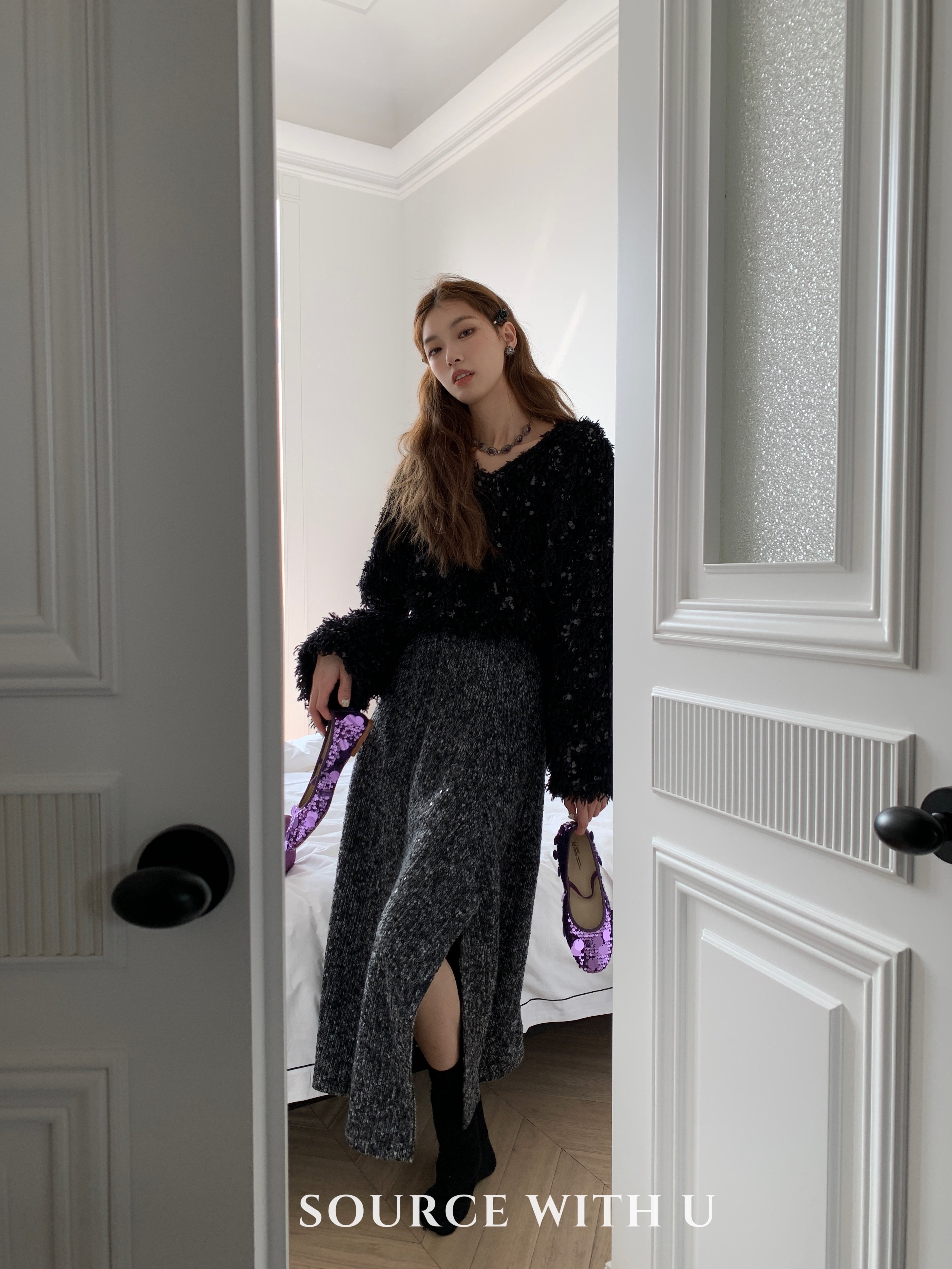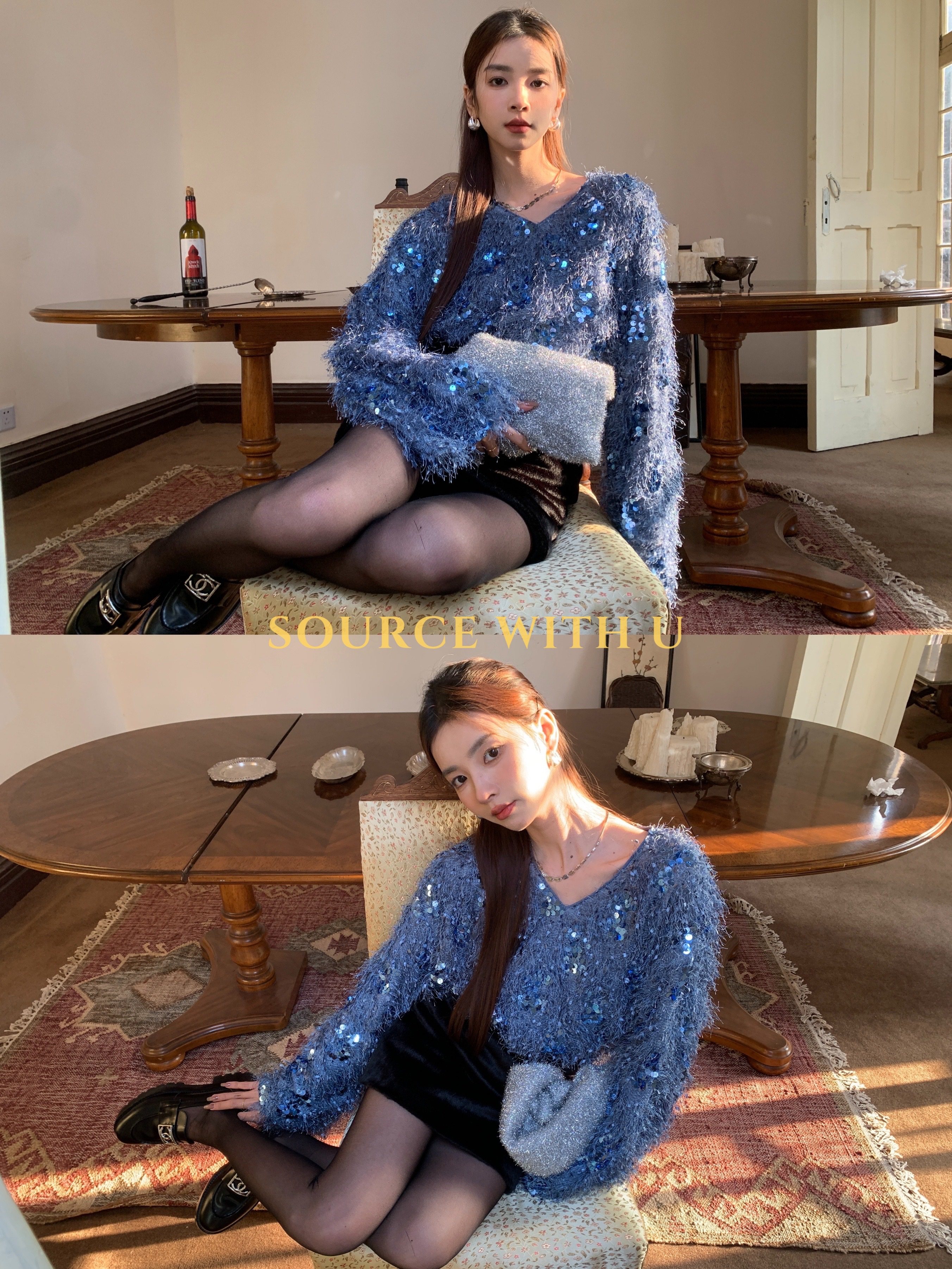 SourceWithU女主光环 全场焦点2色闪闪亮片毛衣氛围感V领厚实上衣