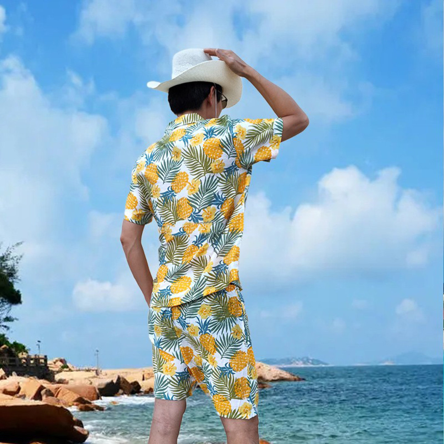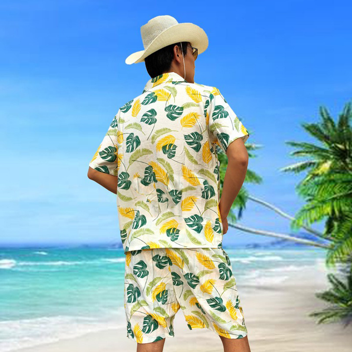 肥胖印花蓝沙滩休闲人棉宽松大码 黄色度假短袖 衬衫 海岛服软料夏季