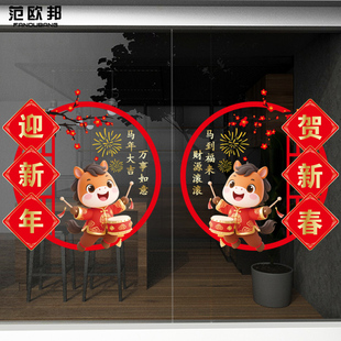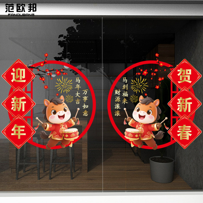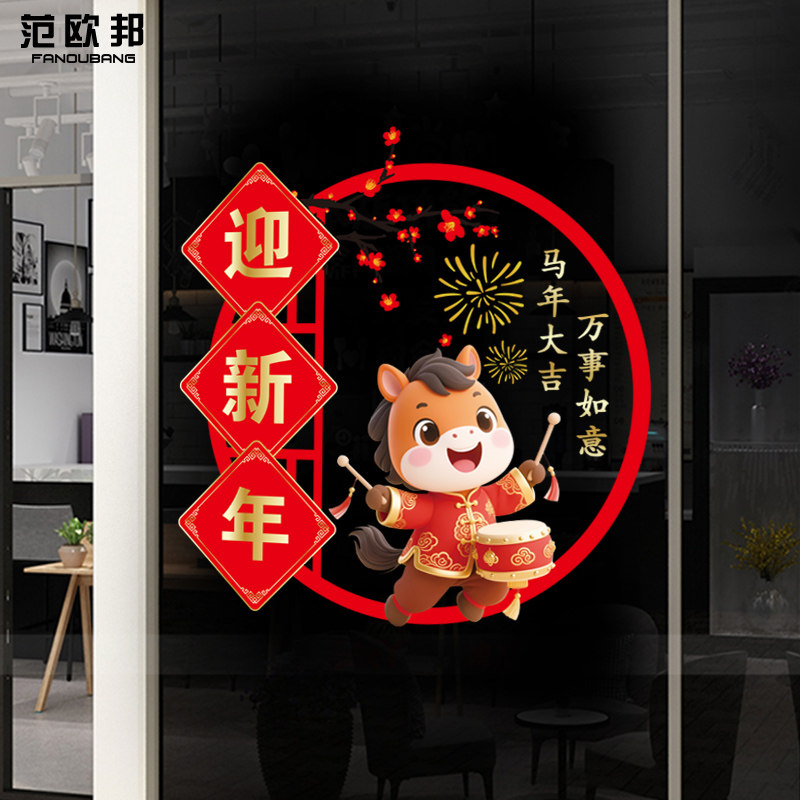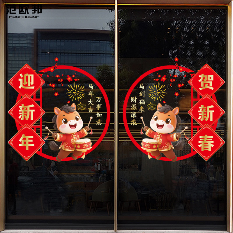 马年窗花吉祥如意2026新年快乐锣鼓马装 旦静电贴 饰玻璃门过年元