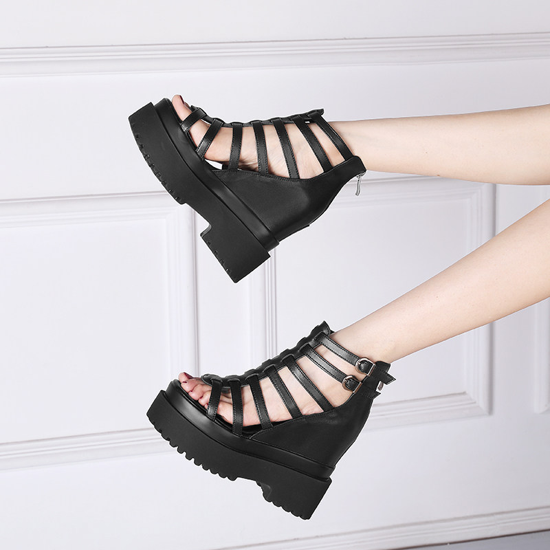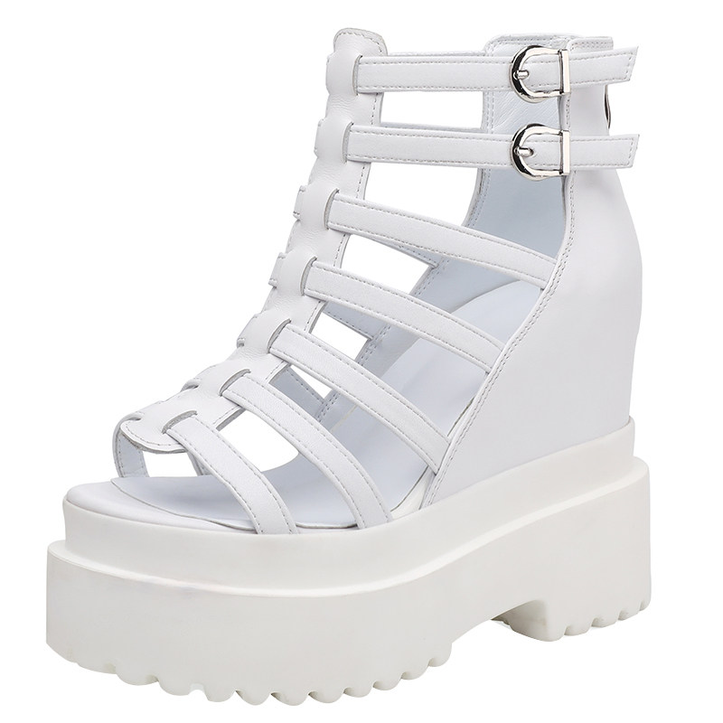 真皮内增高凉靴女2023夏季 潮 百搭白色12CM超高跟松糕坡跟罗马凉鞋