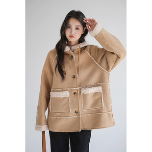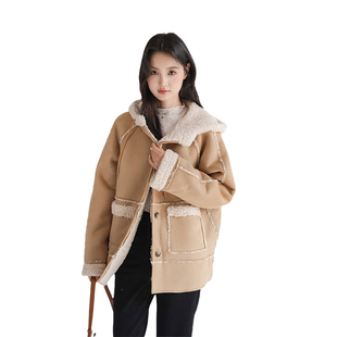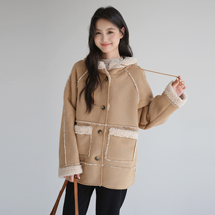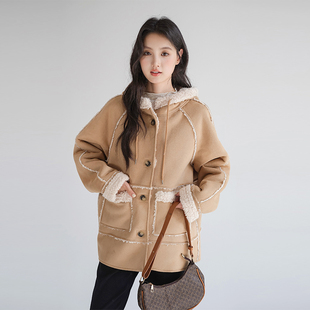 新款 冬装 蓝若水大码 保暖仿羊羔毛宽松大衣 皮毛一体连帽厚外套