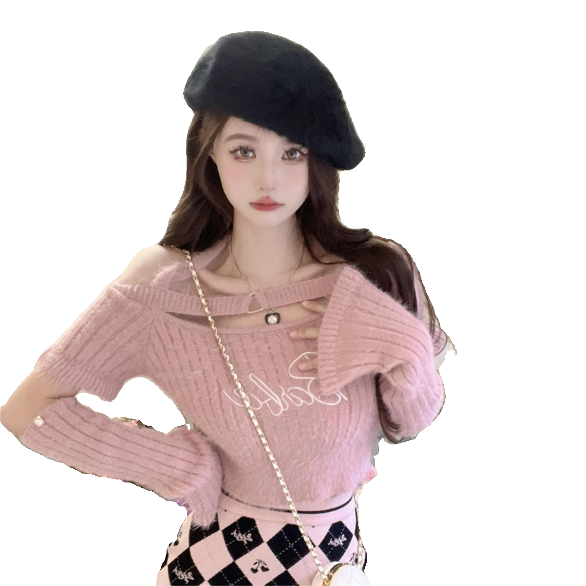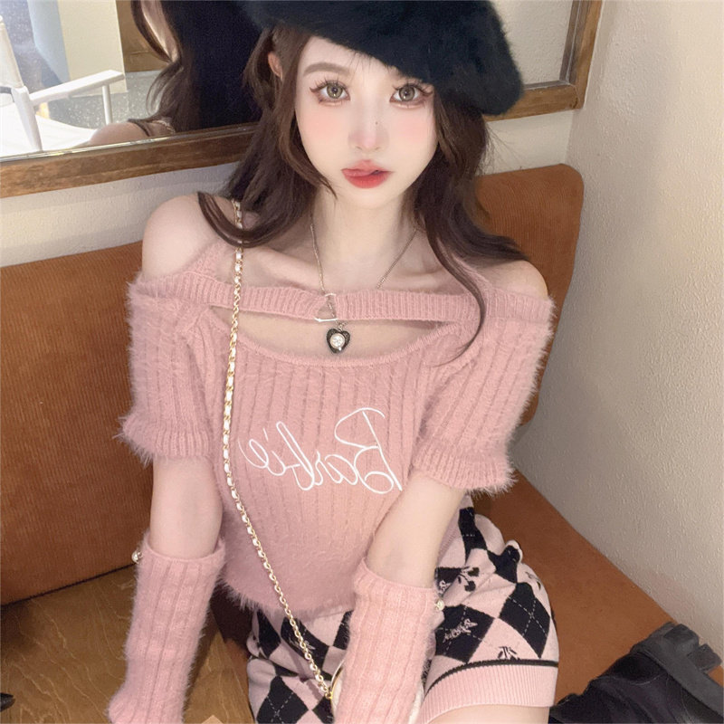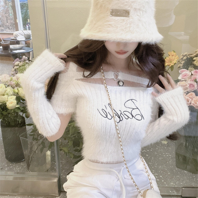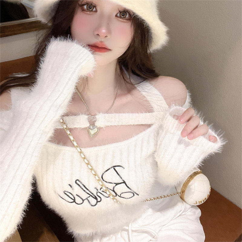 纯欲辣妹性感一字肩挂脖上衣女秋冬内搭水貂绒粉色袖 套针织打底衫