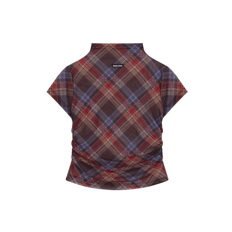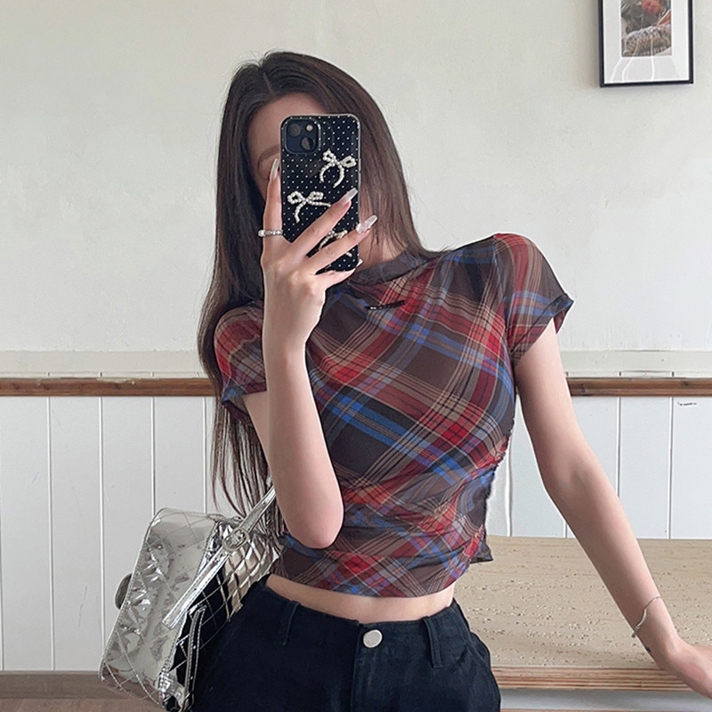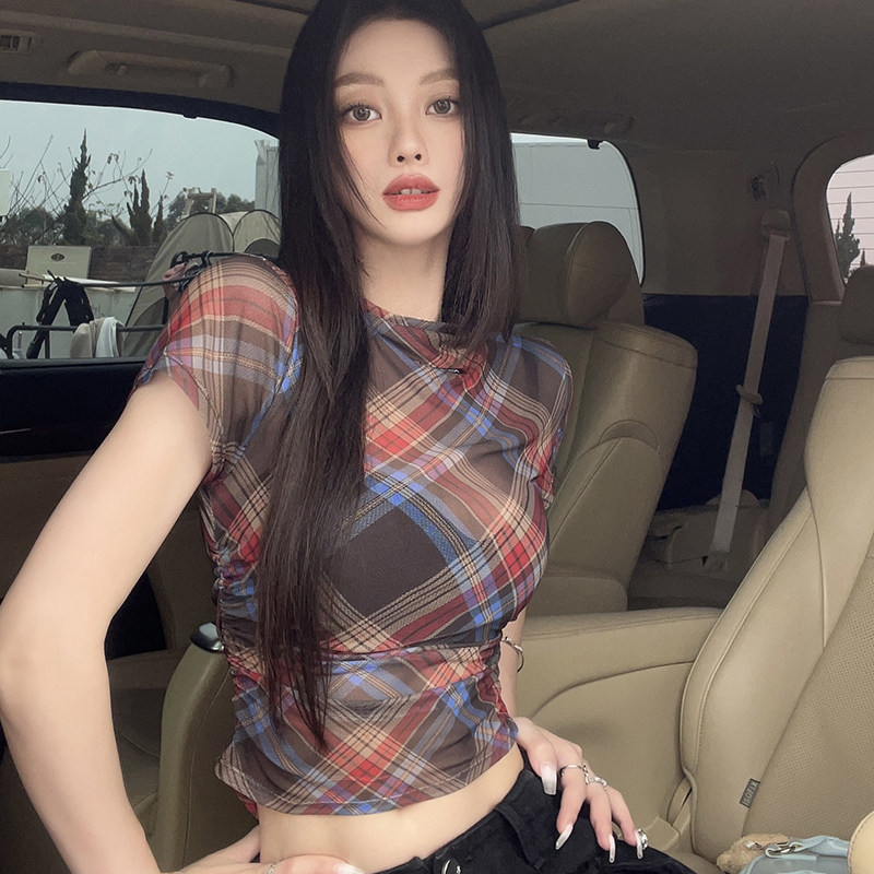 甜辣设计感褶皱显瘦短款 t恤女夏季 上衣 胖mm格子圆领正肩短袖 大码