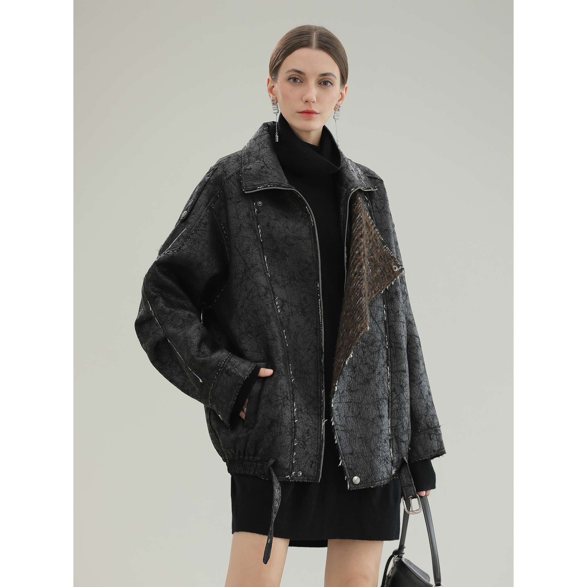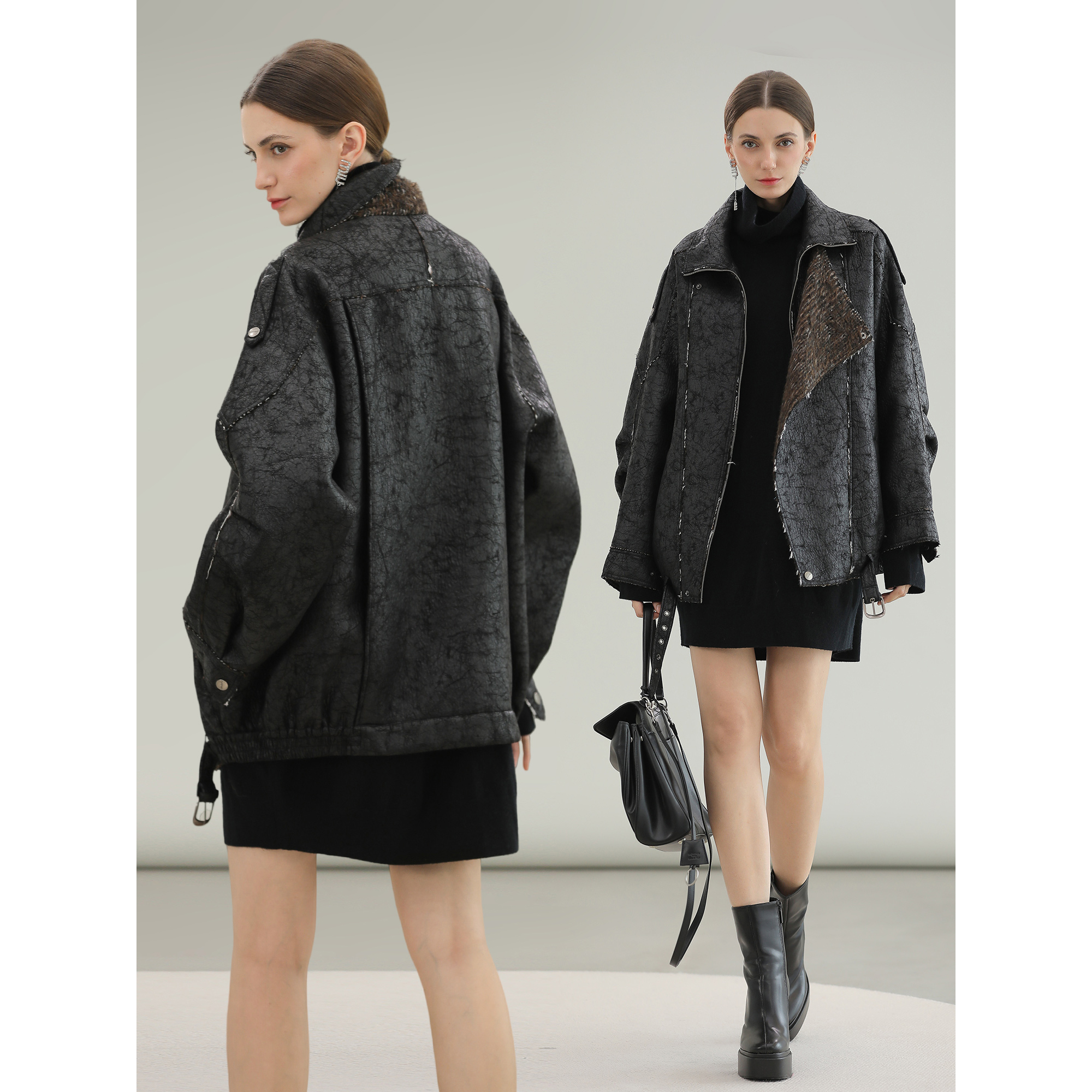 仿麂皮纹理感复古做旧廓形皮衣短夹克外套 巴赫旧约 Xinlei Lin