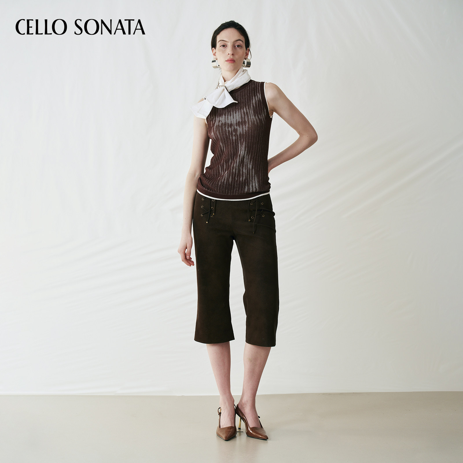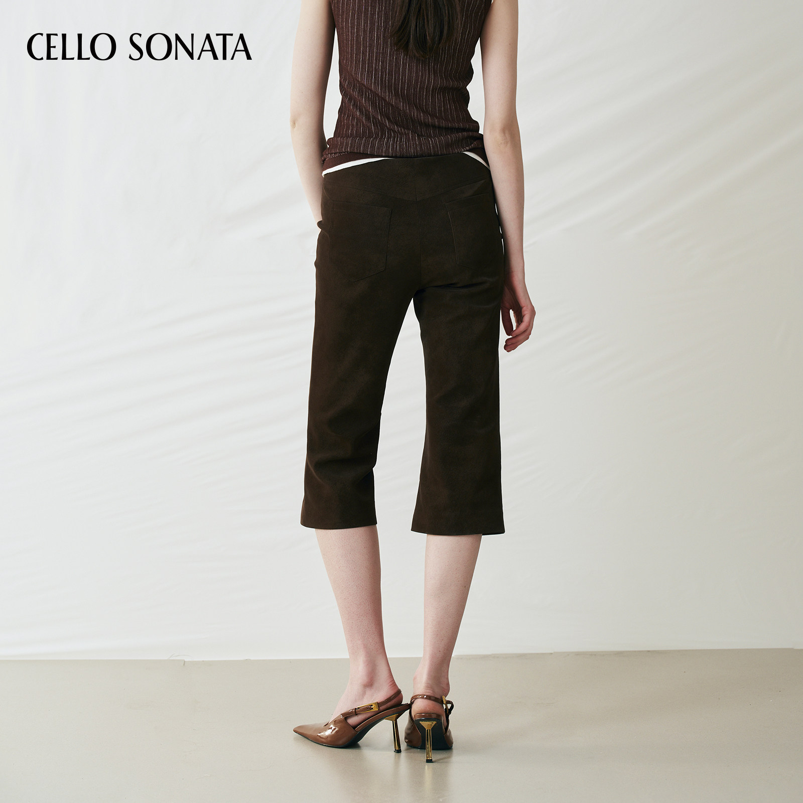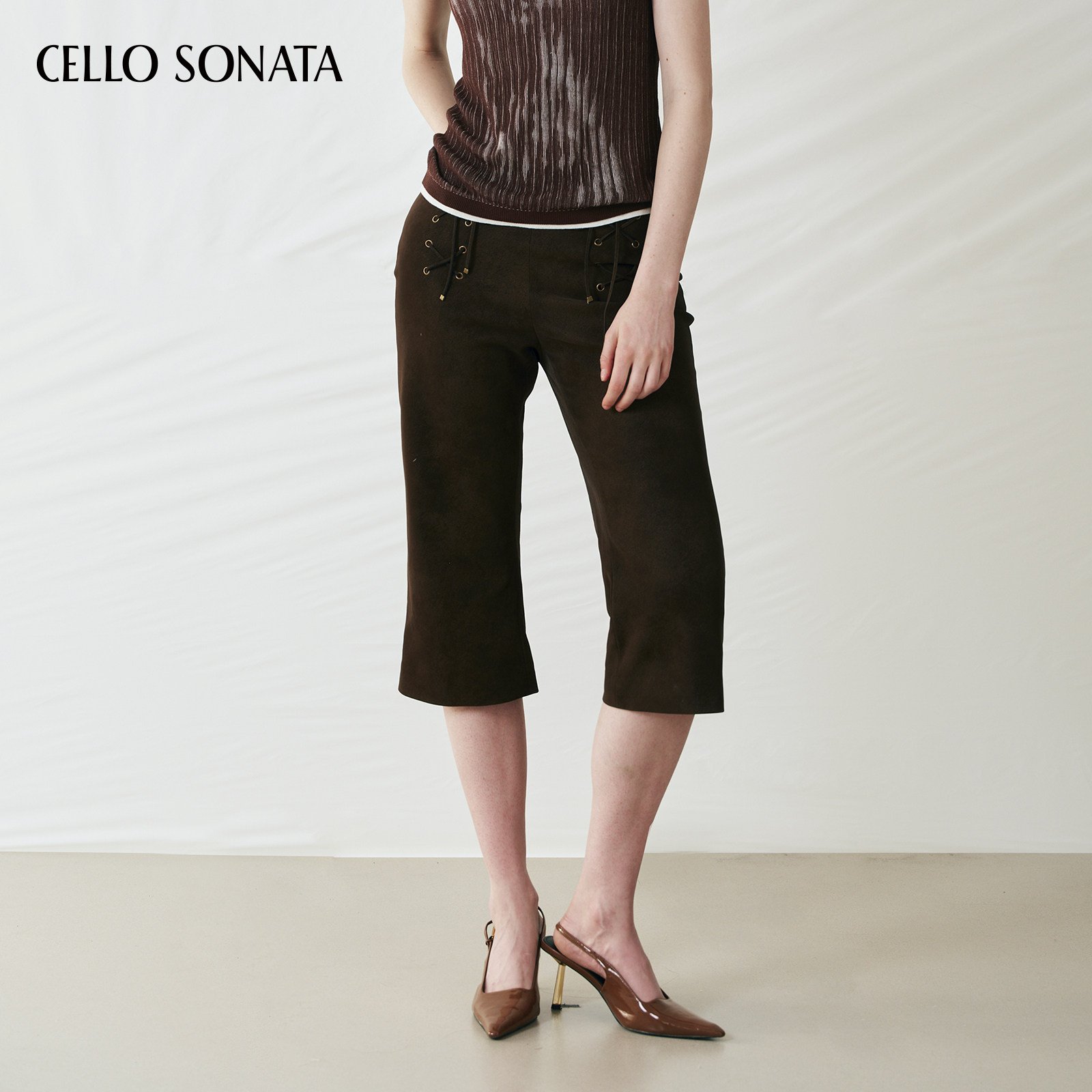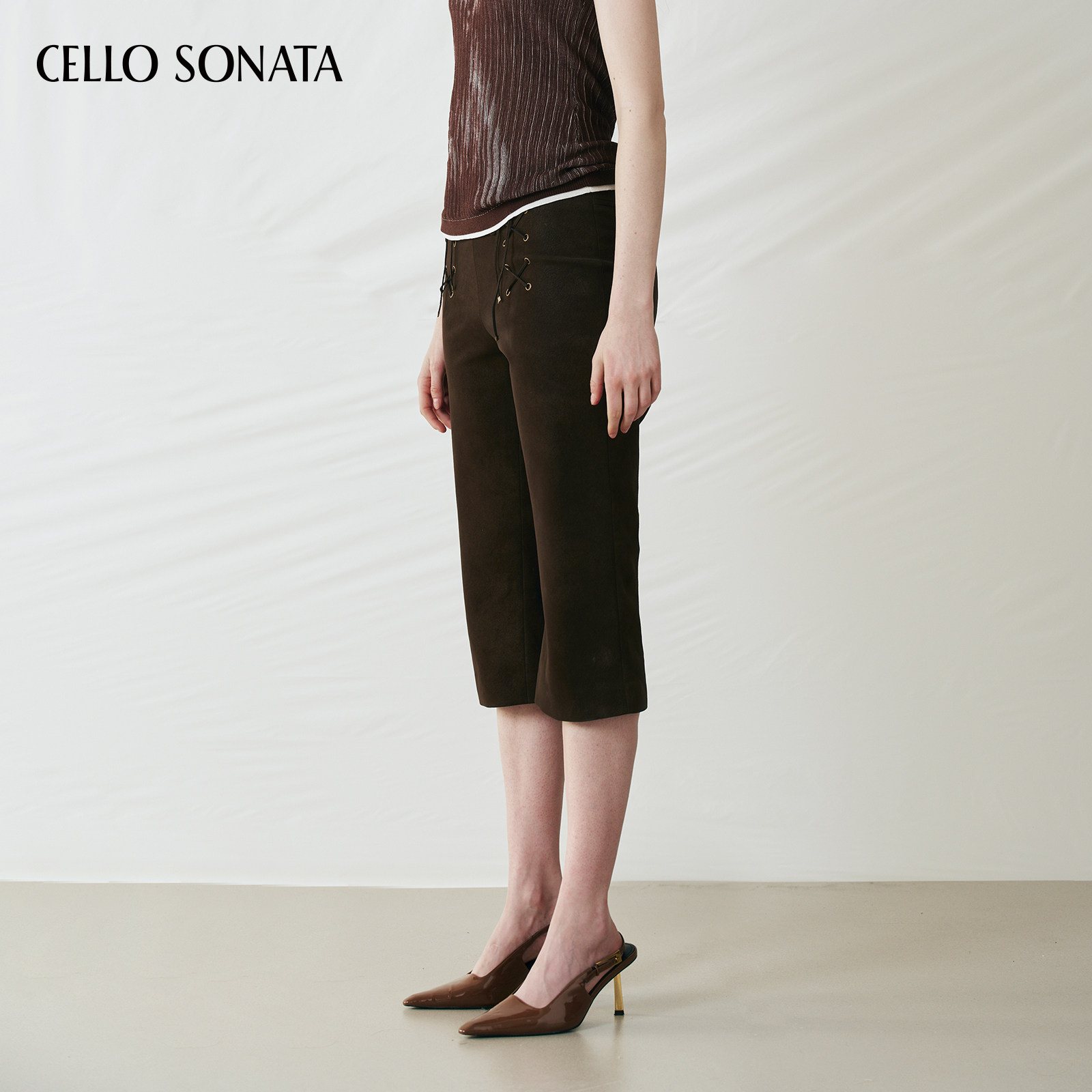 Sonata Cello 25秋 纯色穿孔绑带休闲裤 女 皮革直筒七分裤 新款