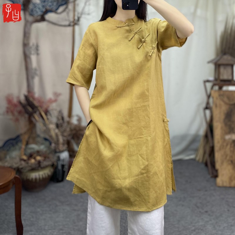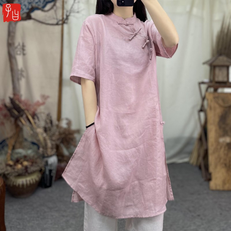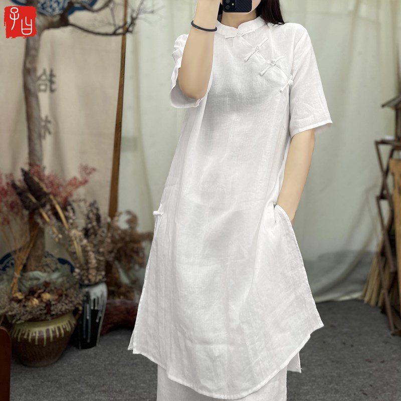 子曰改良中式 立领斜襟手工盘扣旗袍D裙禅意苎麻茶服文艺中长连衣
