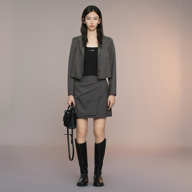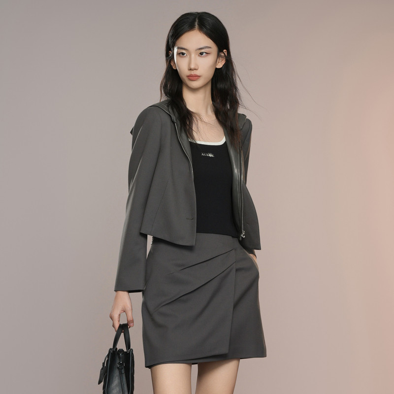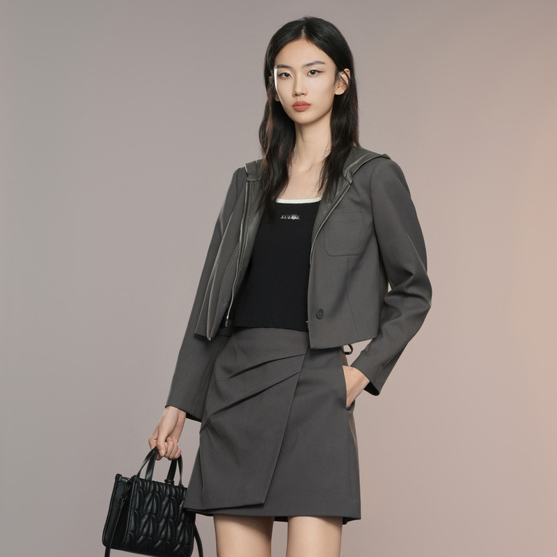 短外套女装 XG雪歌深灰色连帽短外套2025秋季 拼接皮衣长袖 西装 新款