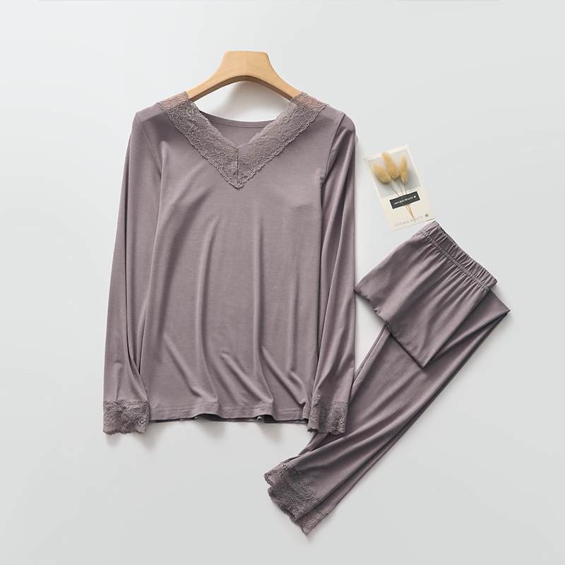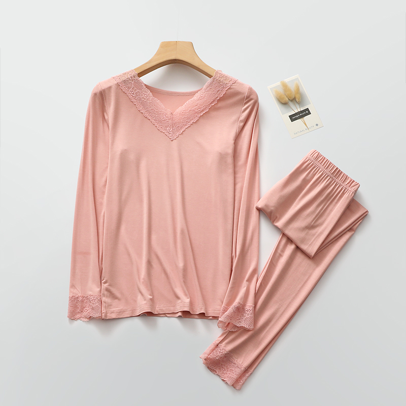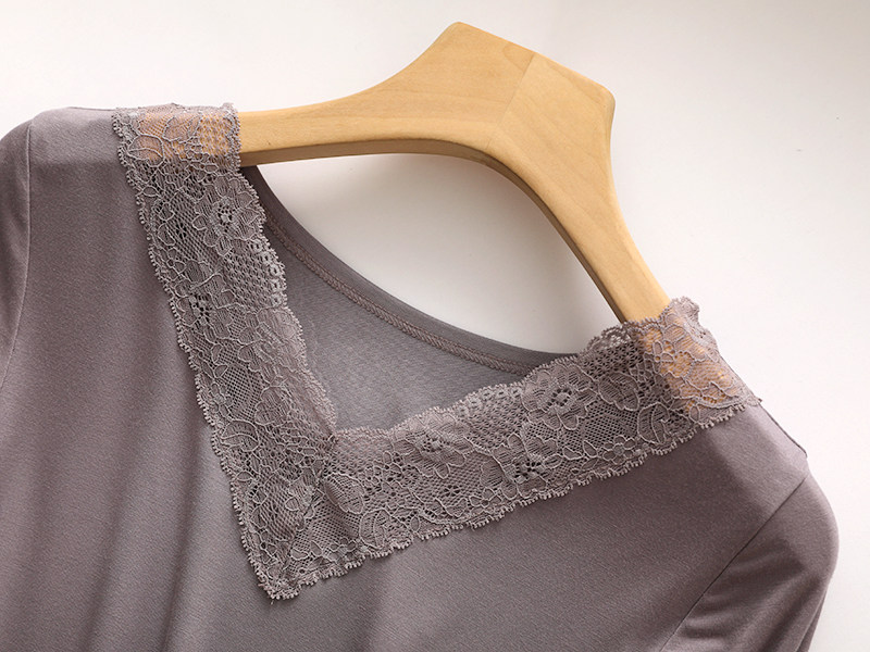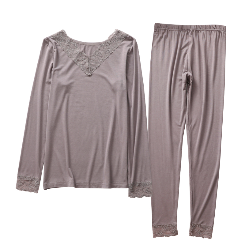 女莫代尔秋冬季 修身 贴身V领套头打底衫 长裤 内衣 长袖 蕾丝秋衣秋裤
