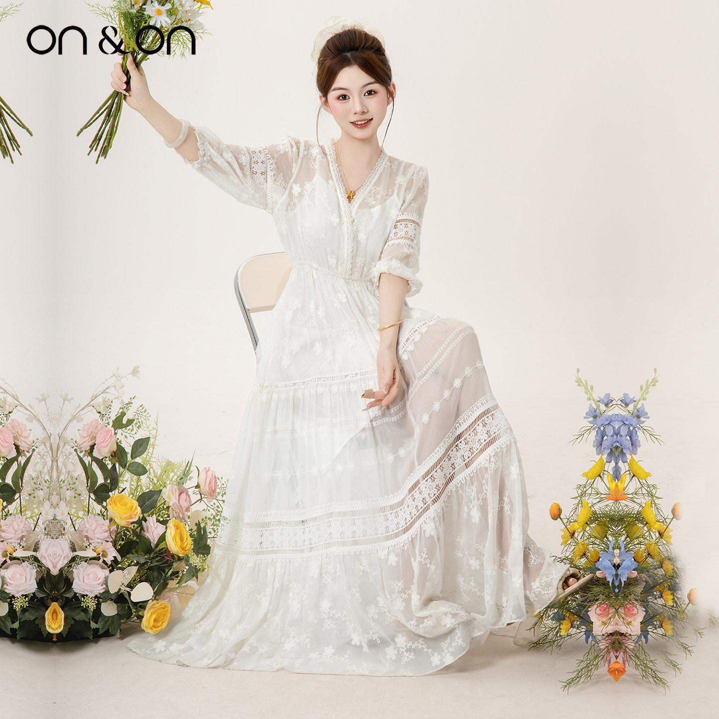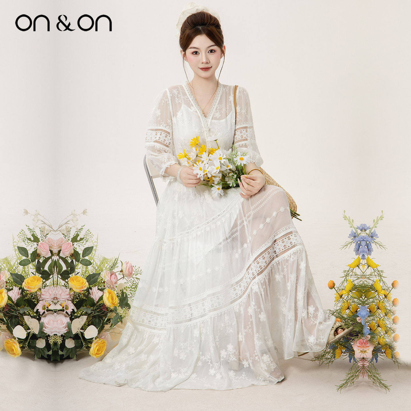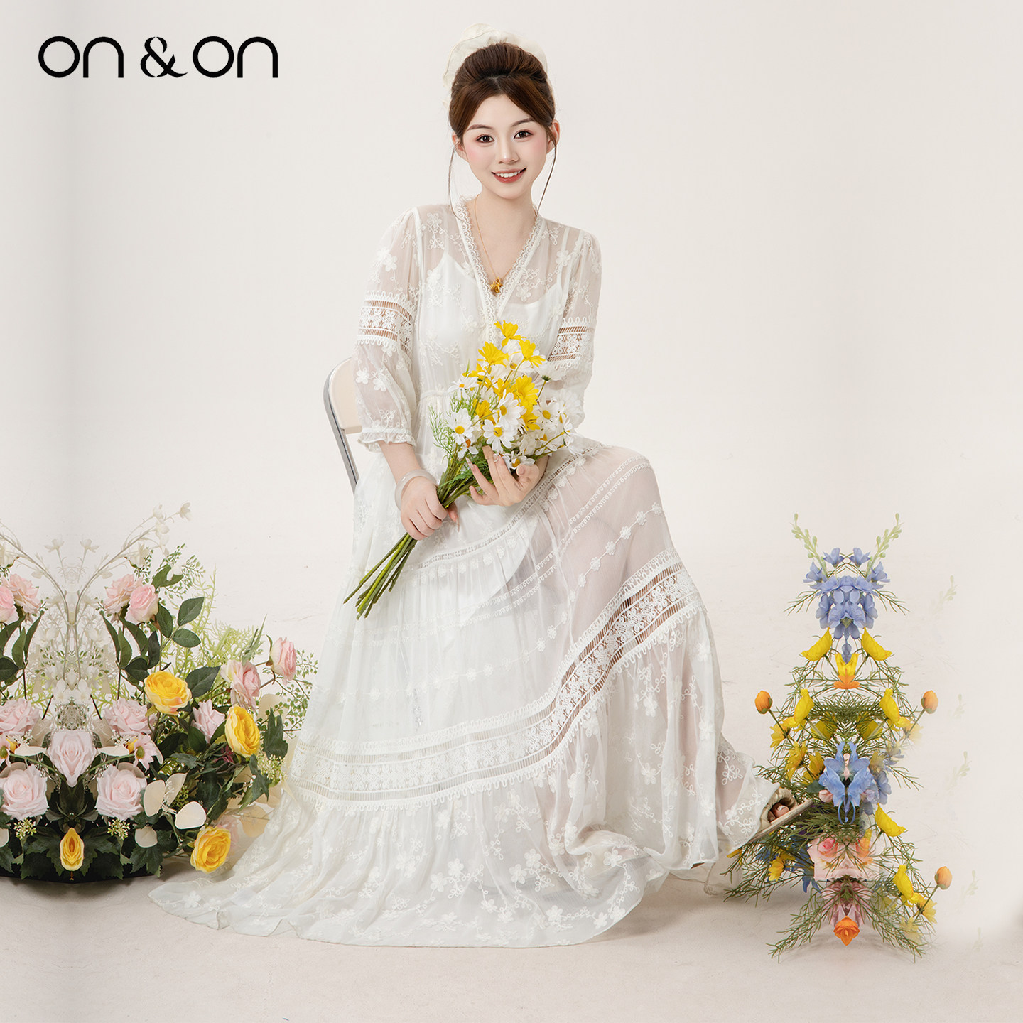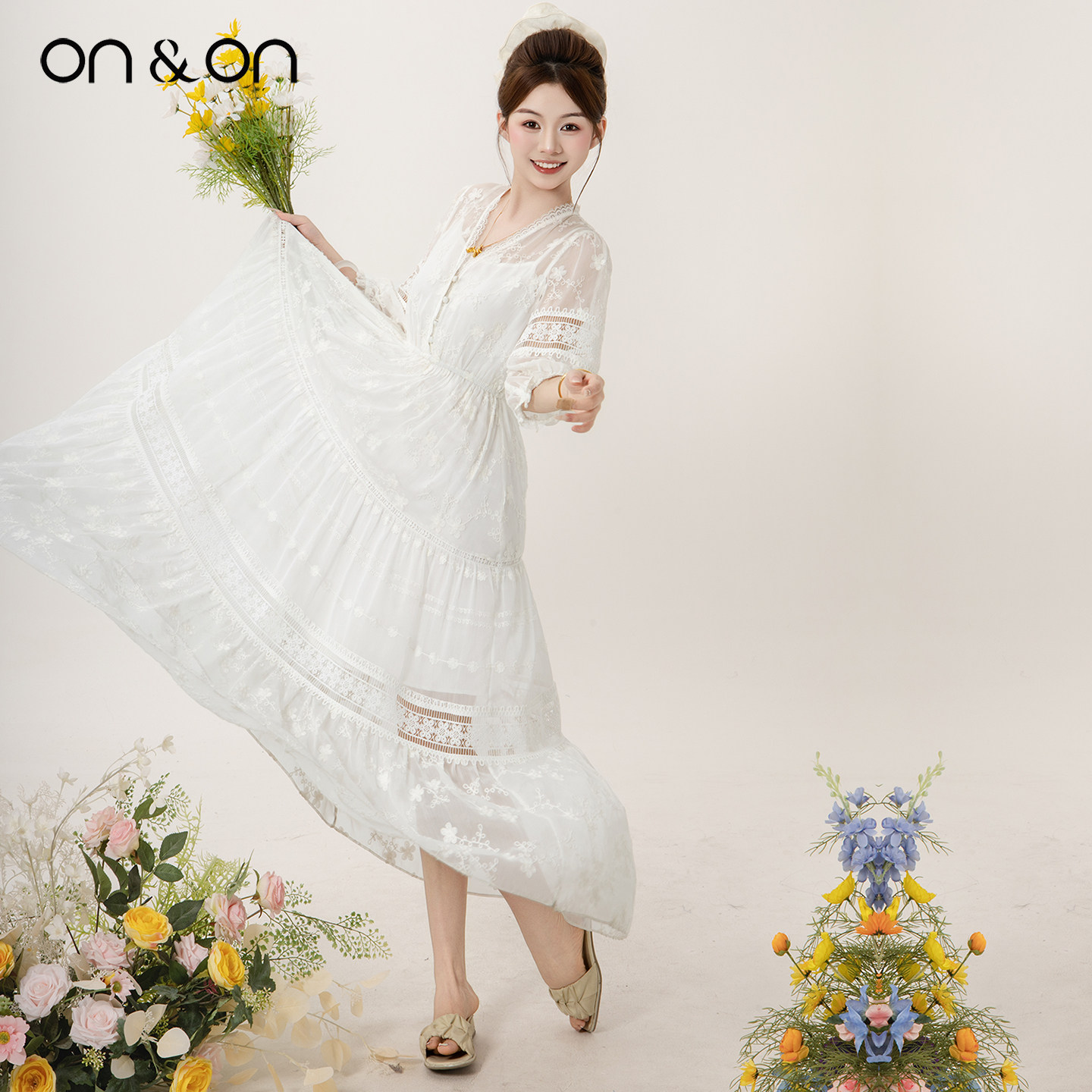 新款 ON&ON 25夏季 游牧风 V领松紧收腰波西米亚风连衣裙 安乃安