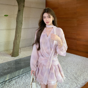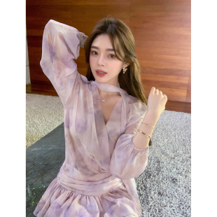 灯笼袖 新款 v领雪纺紫色碎花连衣裙荷叶边裙摆印花短裙 夏季 ByYou