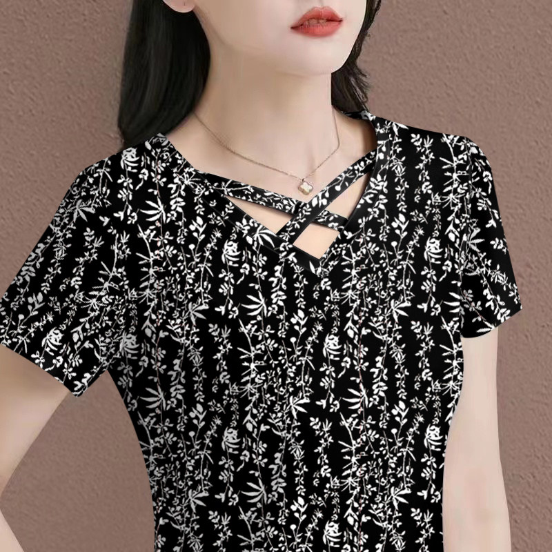 遮肚休闲显瘦T恤女印花上衣潮 减龄V领短袖 高档气质2025新款 夏季