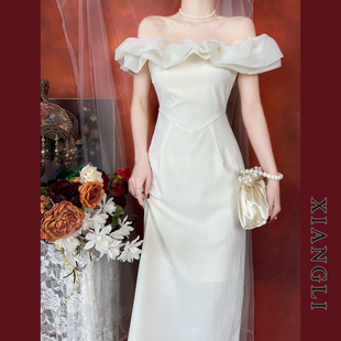 巷里法式 赫本一字肩拼接显瘦气质订婚小礼服长裙 复古连衣裙女夏装