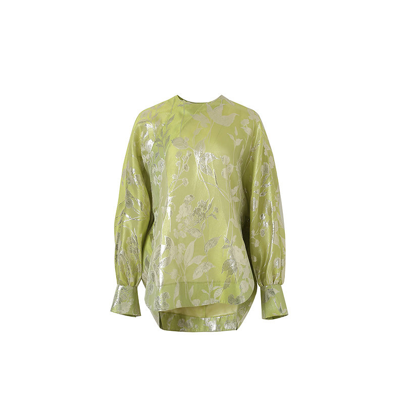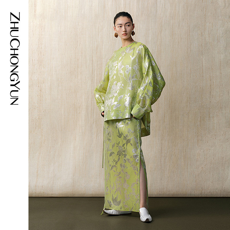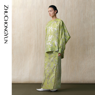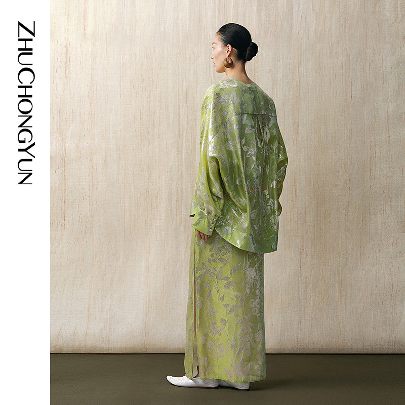 ZHUCHONGYUN2025春新款 上衣 绿色丝光提花宽松直身圆领斜襟新中式