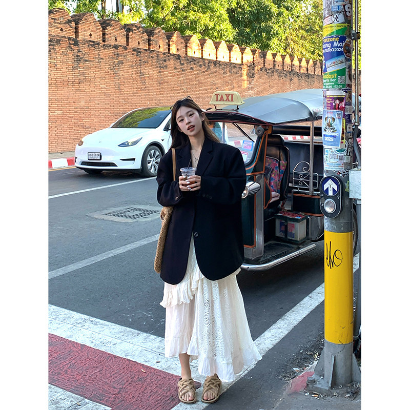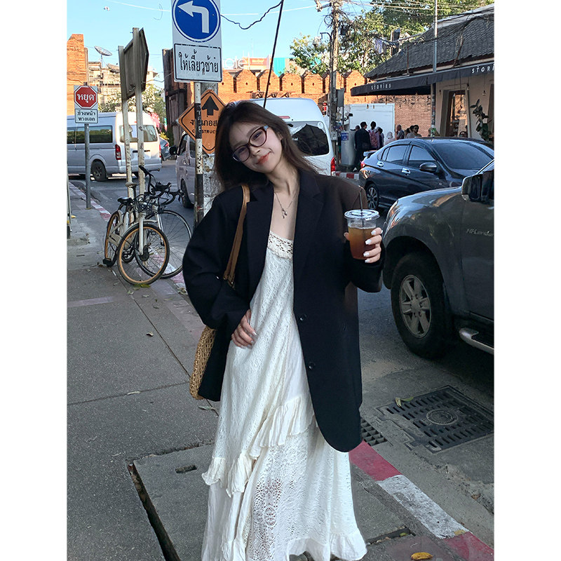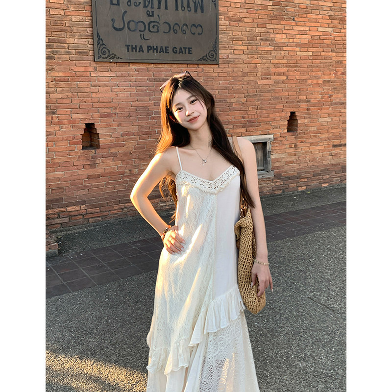 Adan 气质显瘦百搭设计感拼接吊带连衣裙女 棉麻感蕾丝拼接裙夏季