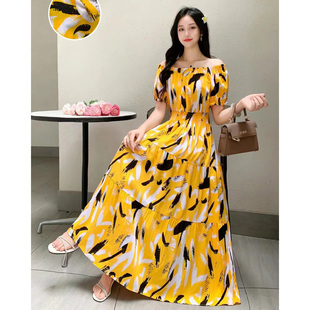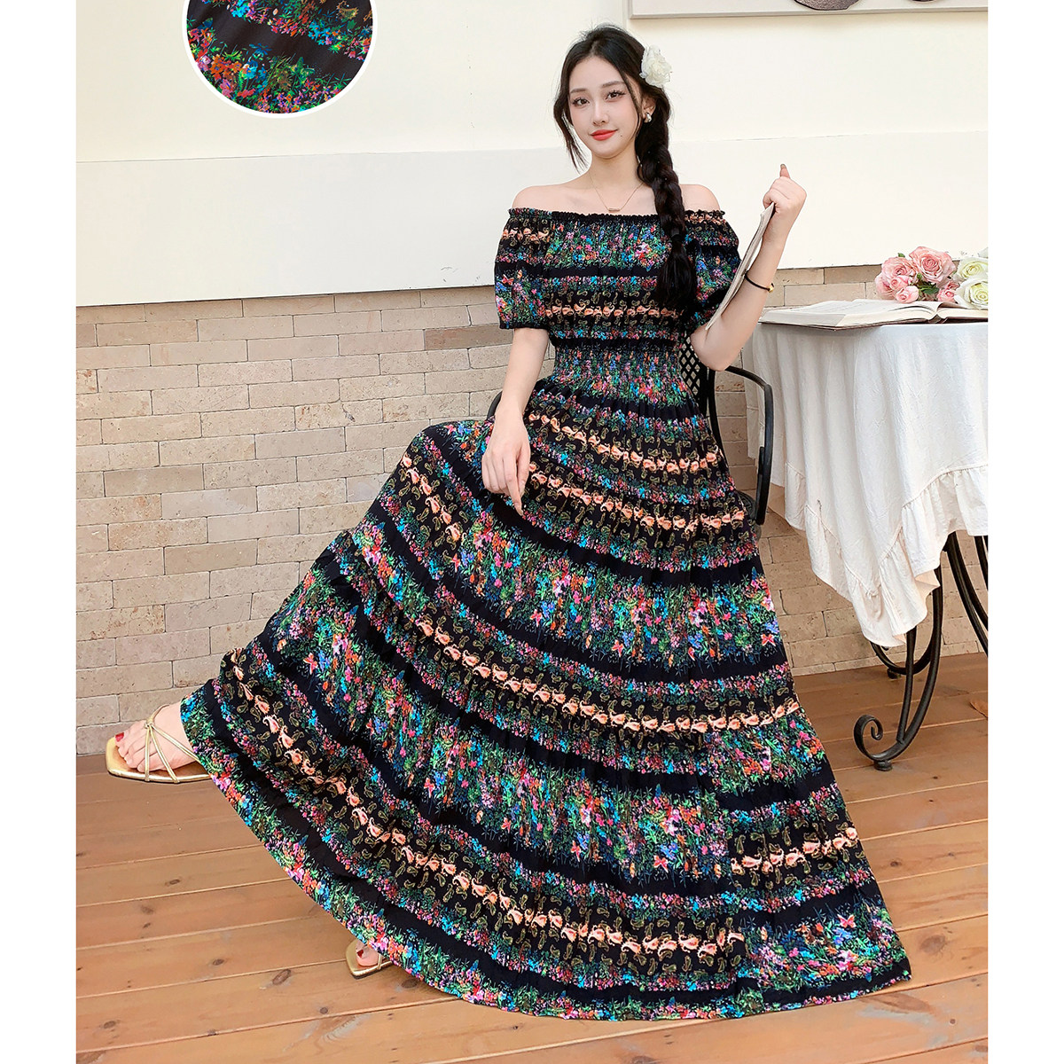 碎花长裙沙滩裙棉绸印花连衣裙人棉大摆裙度假裙短袖 波西米亚长款