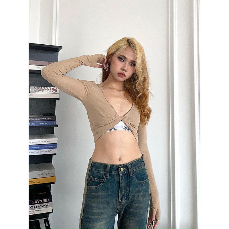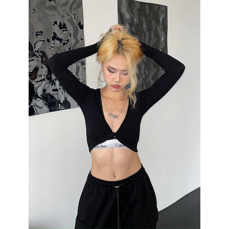 t恤 内搭罩衫 YAMMYUKI深v美式 复古爵士紧身性感上衣露肚脐黑色长袖