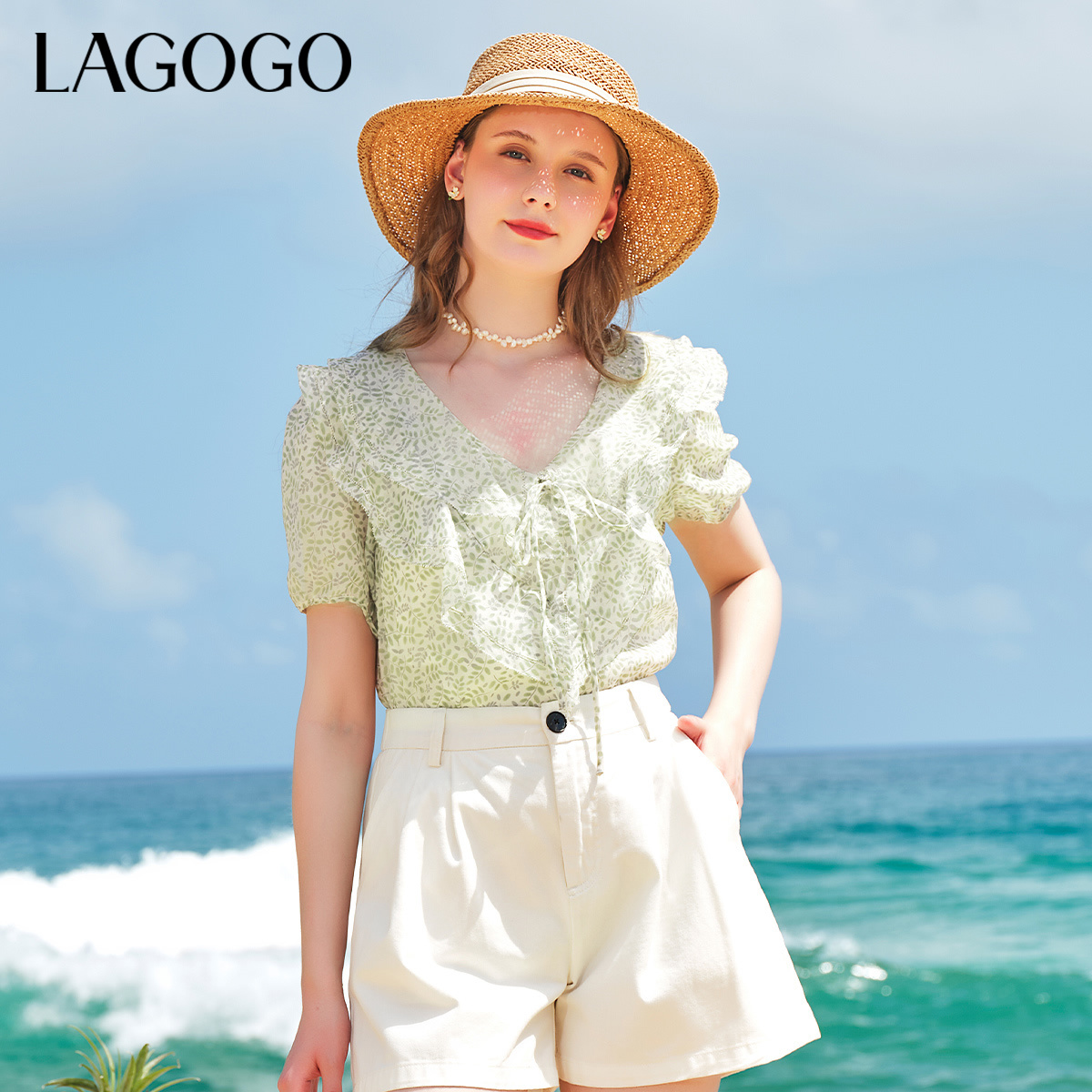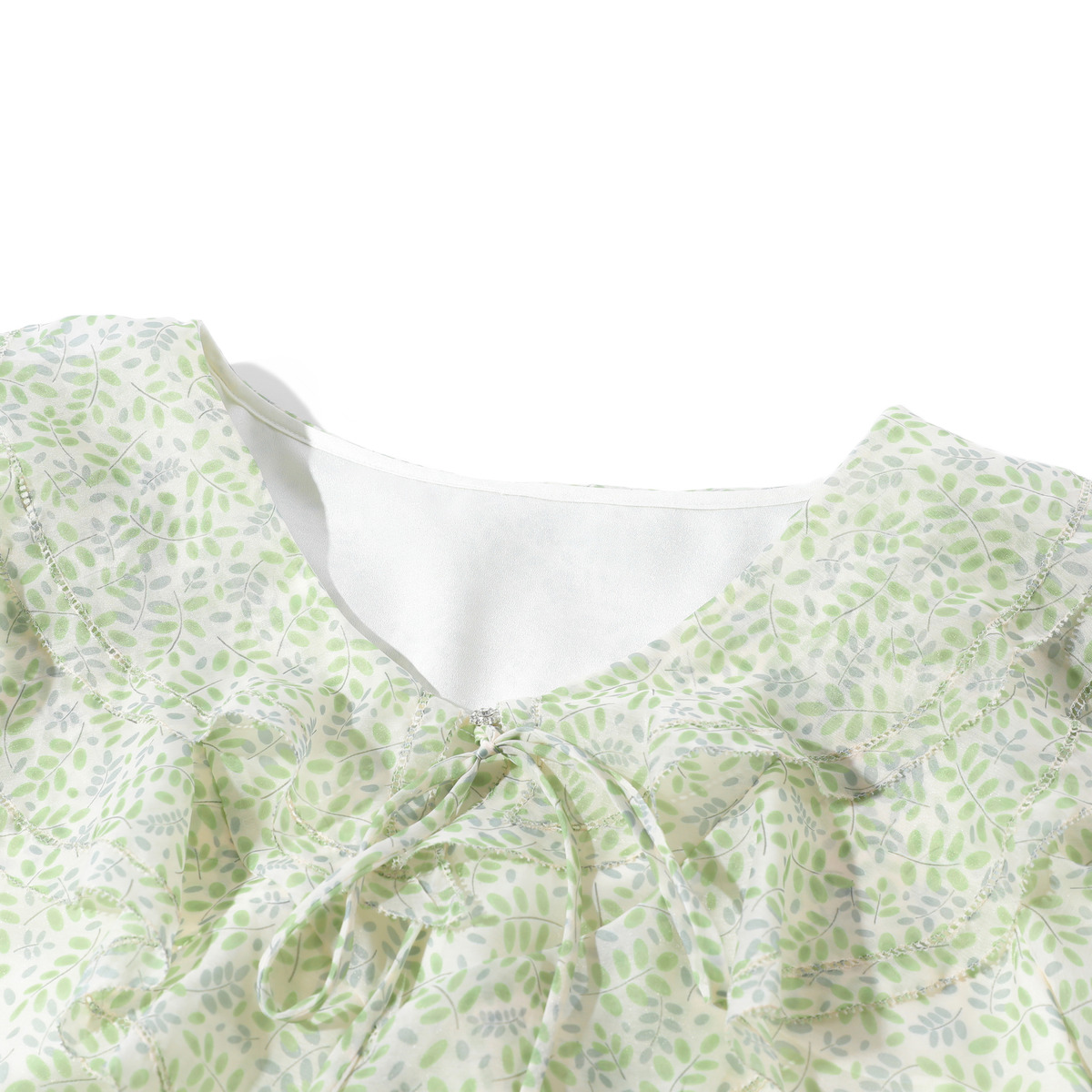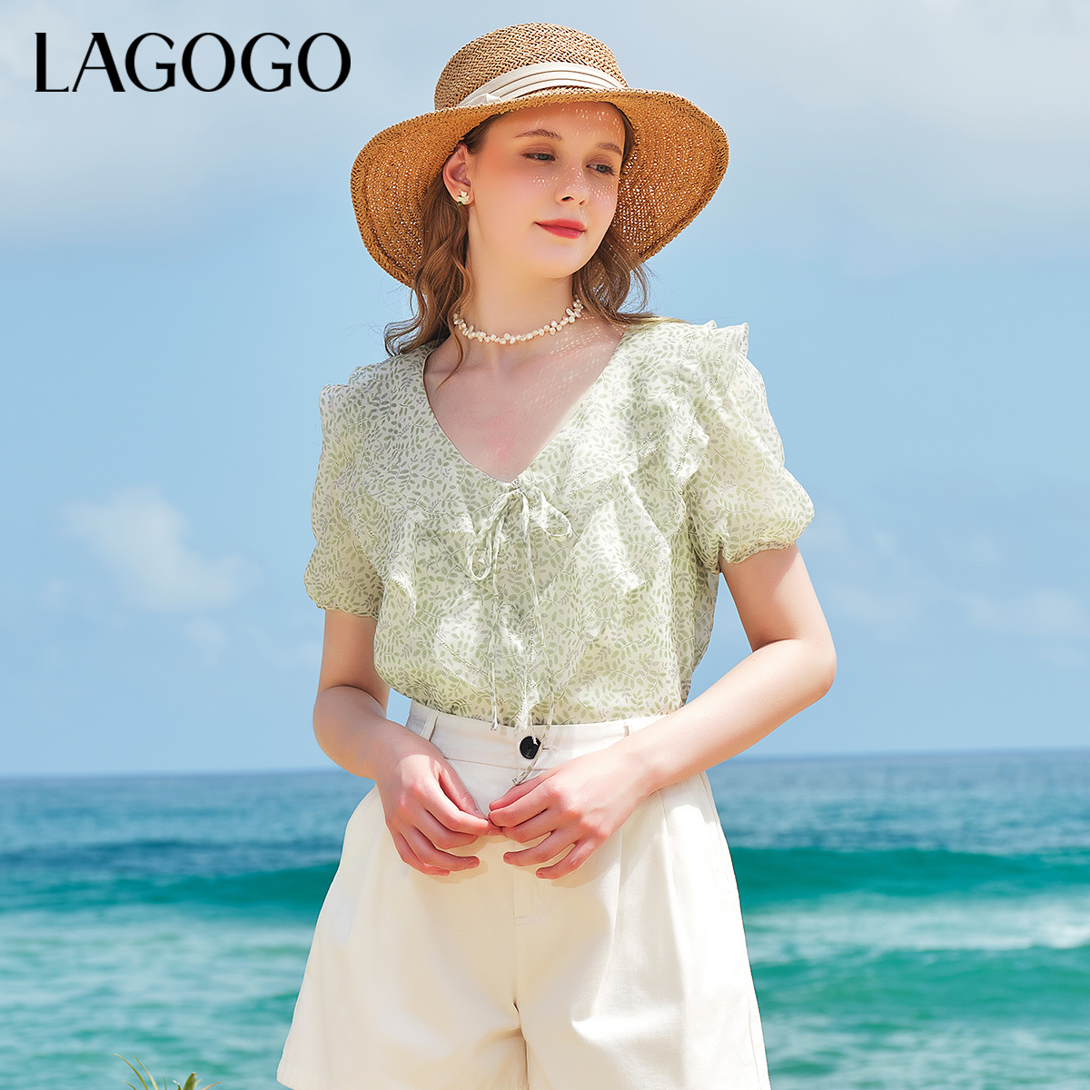 新款 2024年夏季 荷叶边碎花上衣女 雪纺衫 Lagogo拉谷谷薄荷曼波法式