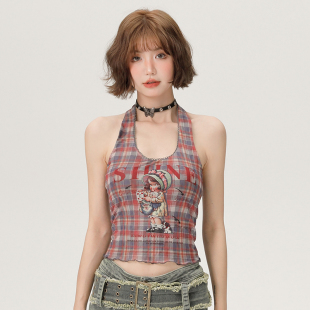 甜酷辣妹内搭上衣 修身 Girlyhalo复古格子挂脖吊带女夏季 新款