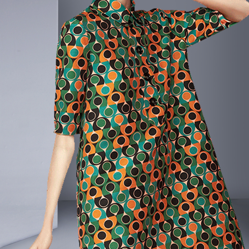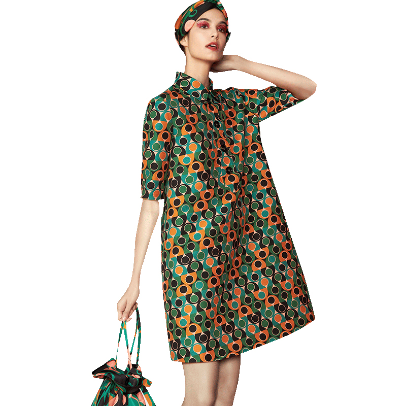 中长款 印花连衣裙宽松大码 阔太太复古裙子小翻领欧美时尚 高档夏季