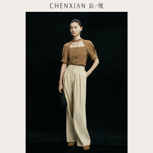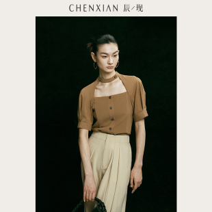 含亚麻灯笼短袖 竹节纹方领简约锁骨衬衫 收腰衬衣女 到手199元