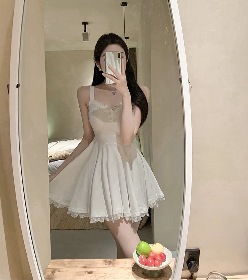 纯欲性感蕾丝拼接吊带连衣裙女夏季 收腰显瘦气质百褶A字短裙 新款