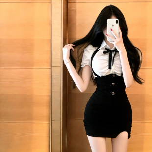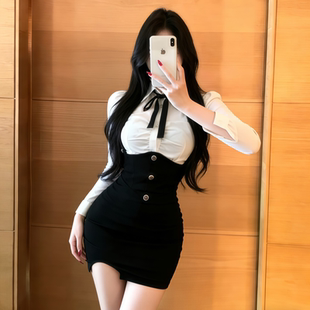 iqcq气球熊挂脖背带连衣裙白色收腰衬衫 女纯欲辣妹包臀裙背带套装
