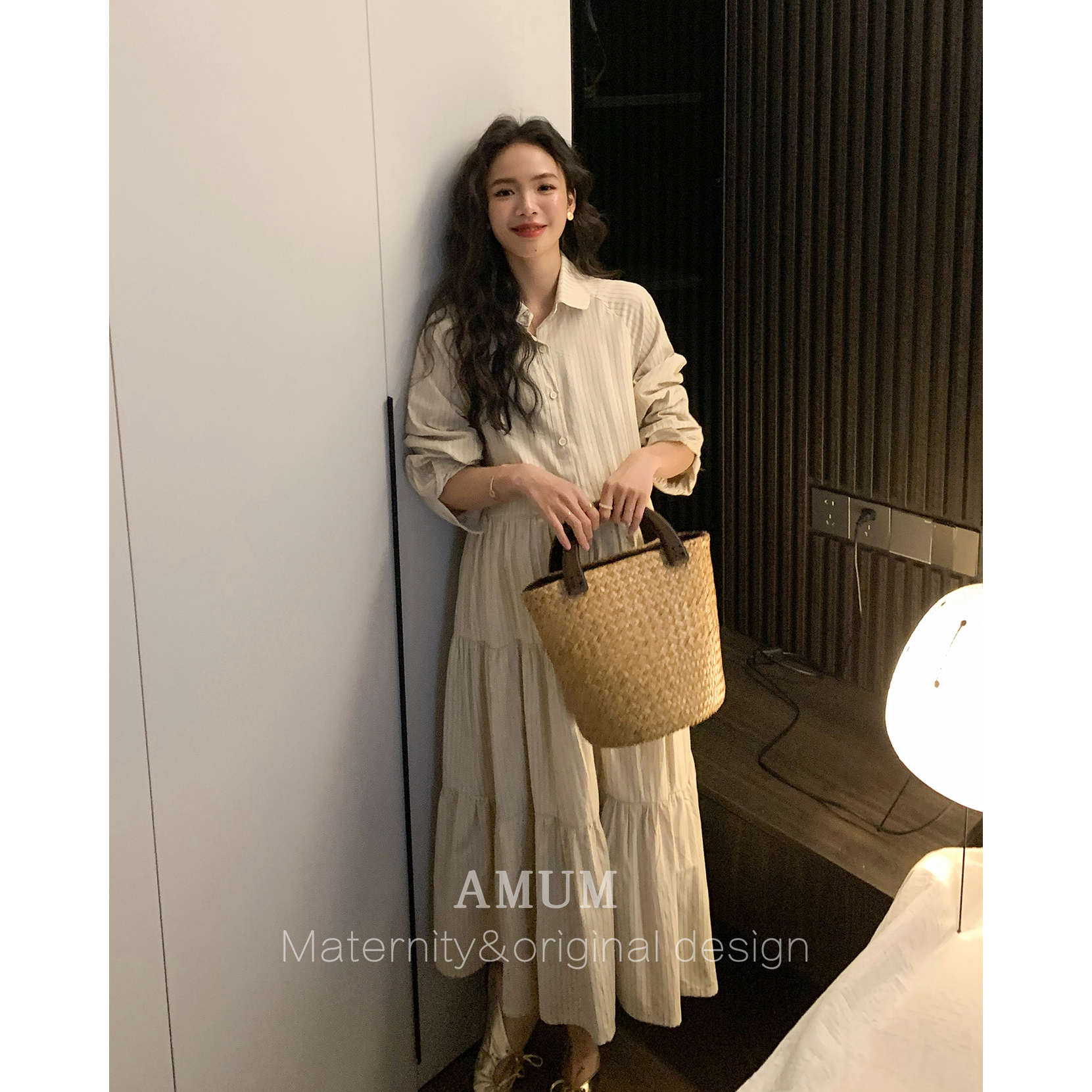 连衣裙秋装 miu系条纹衬衫 首尔画展 设计感蛋糕长裙 AMUM孕妇装