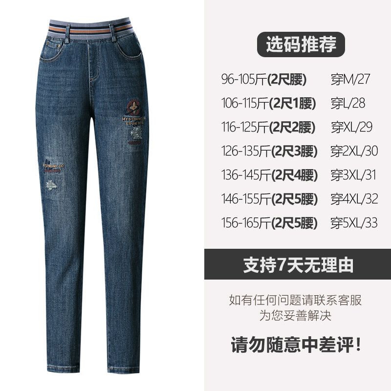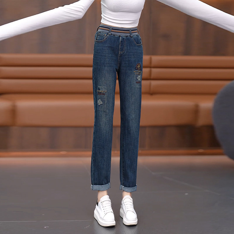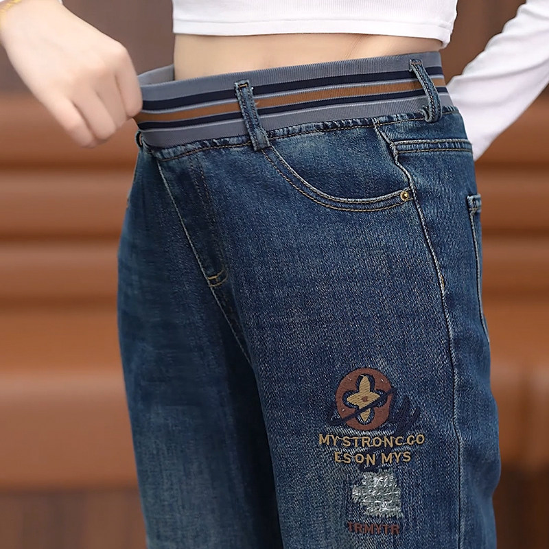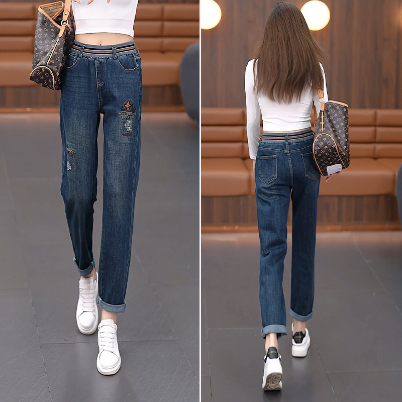 松紧腰刺绣休闲老爹裤 翻边怀旧蓝牛仔裤 韩版 春秋季 子 女磨破哈伦裤
