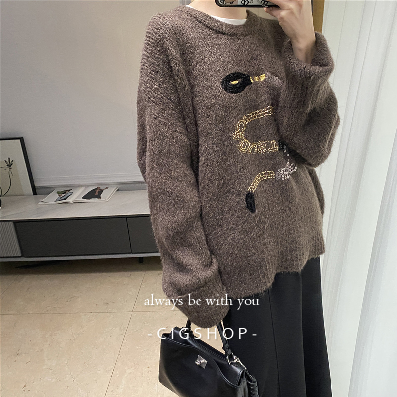圆领休闲上衣舒适条纹刺绣针织衫 毛衣女款 外搭 新款 快鱼2025年秋季