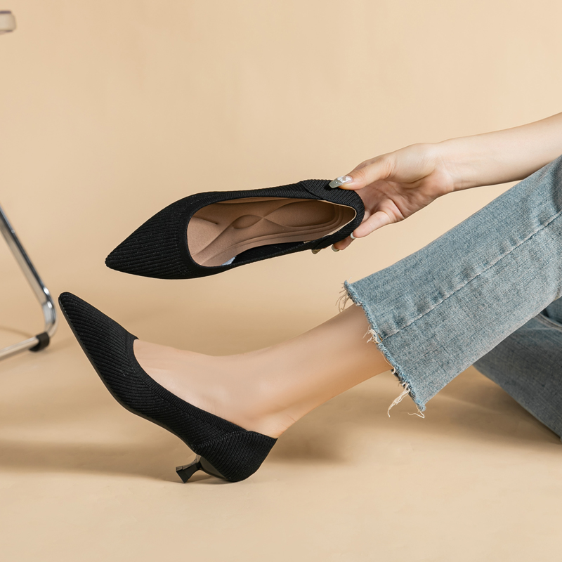 王妃鞋 子女舒适潮1507 蛋卷女士尖头浅口小猫跟软底针织中高跟单鞋