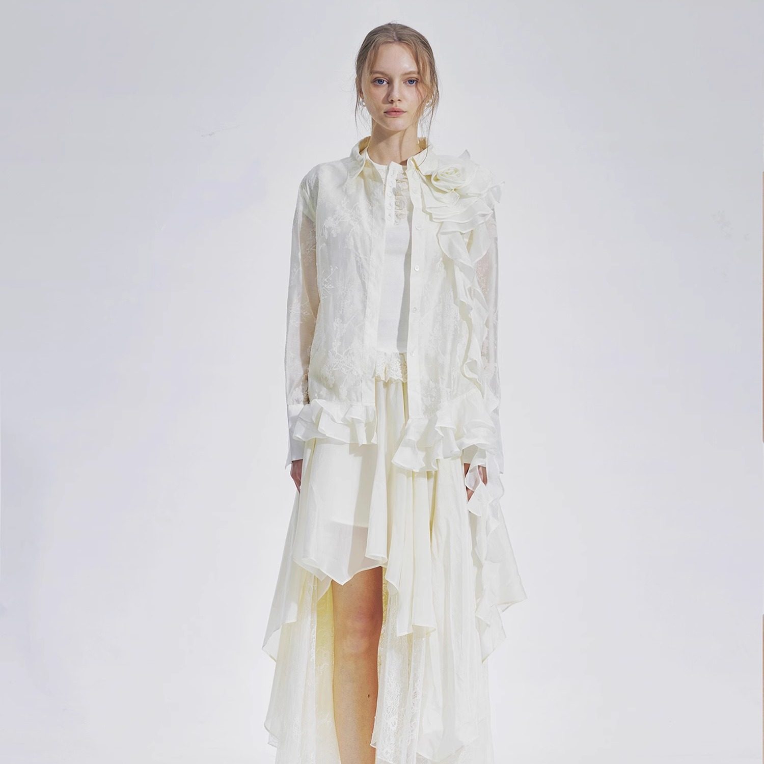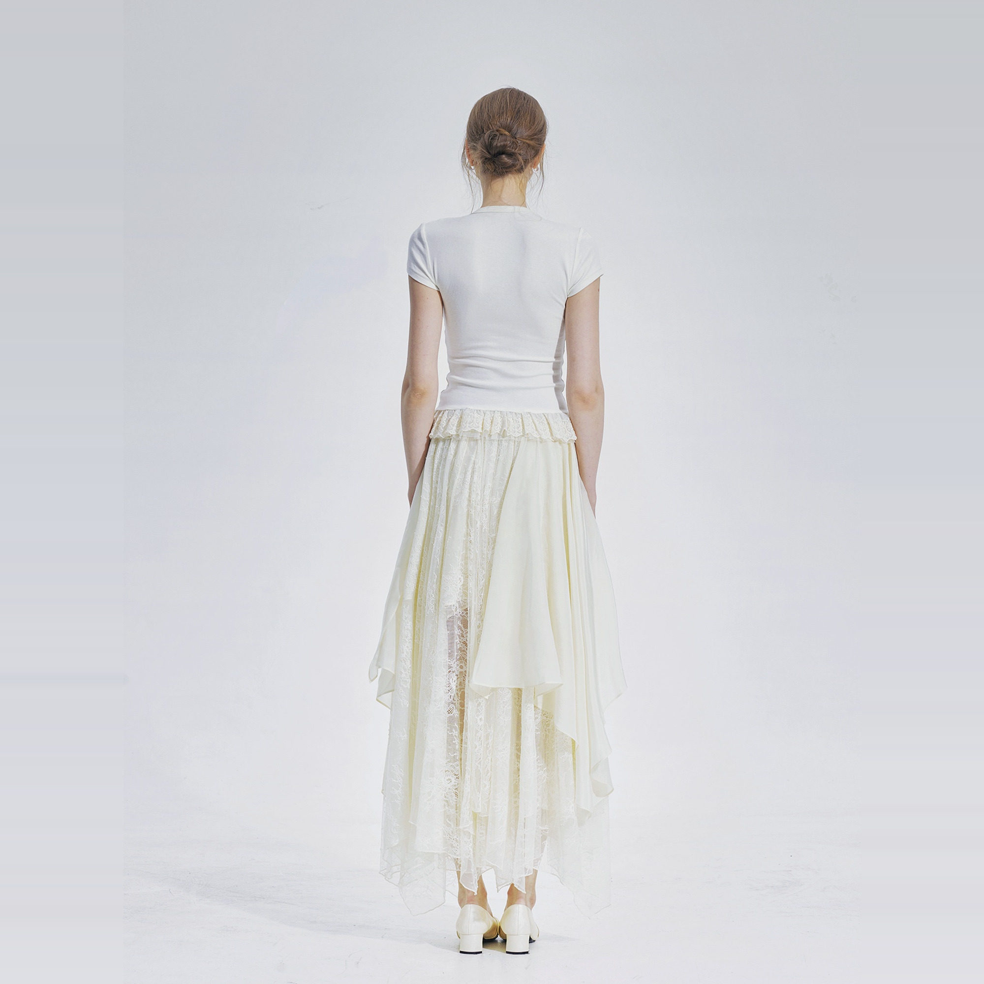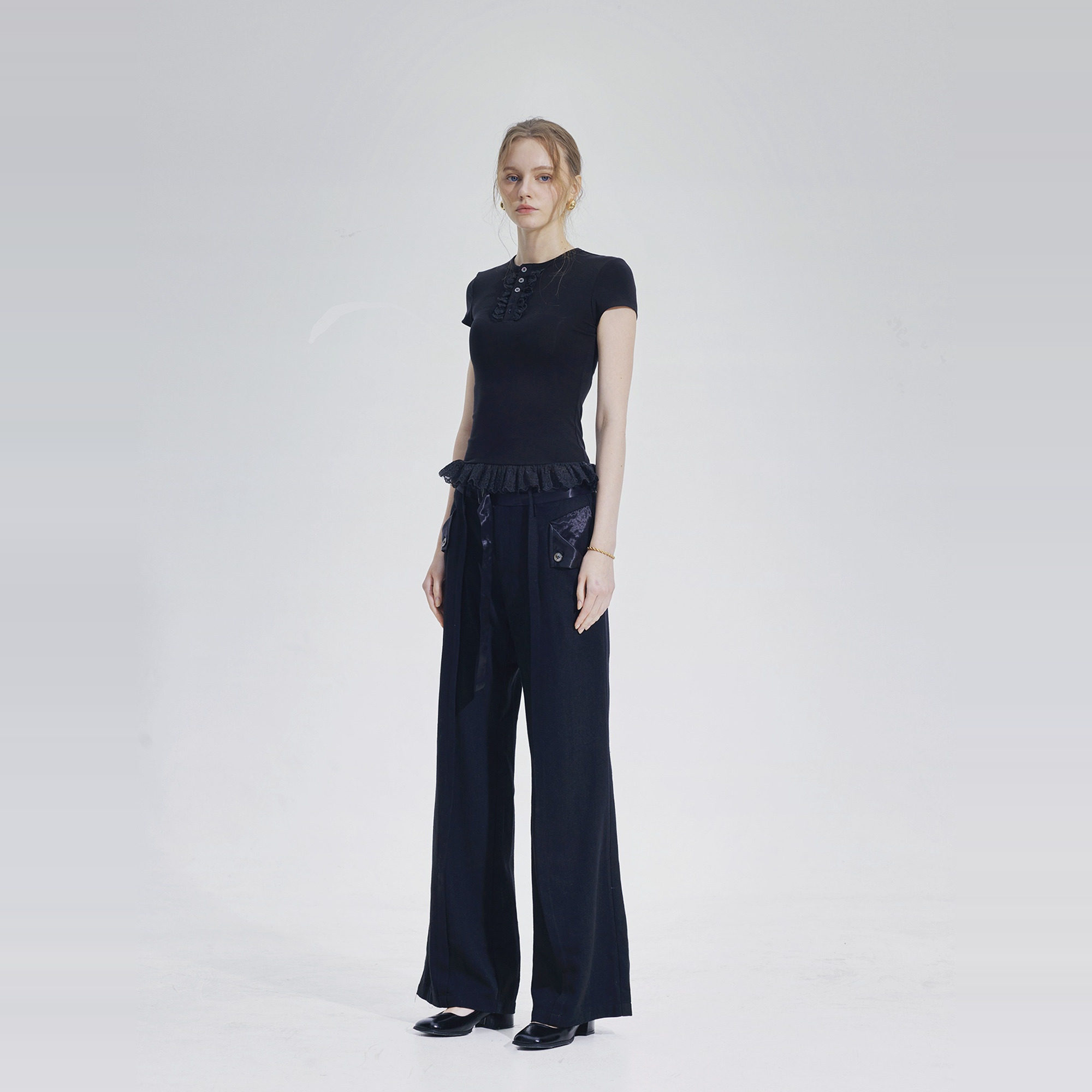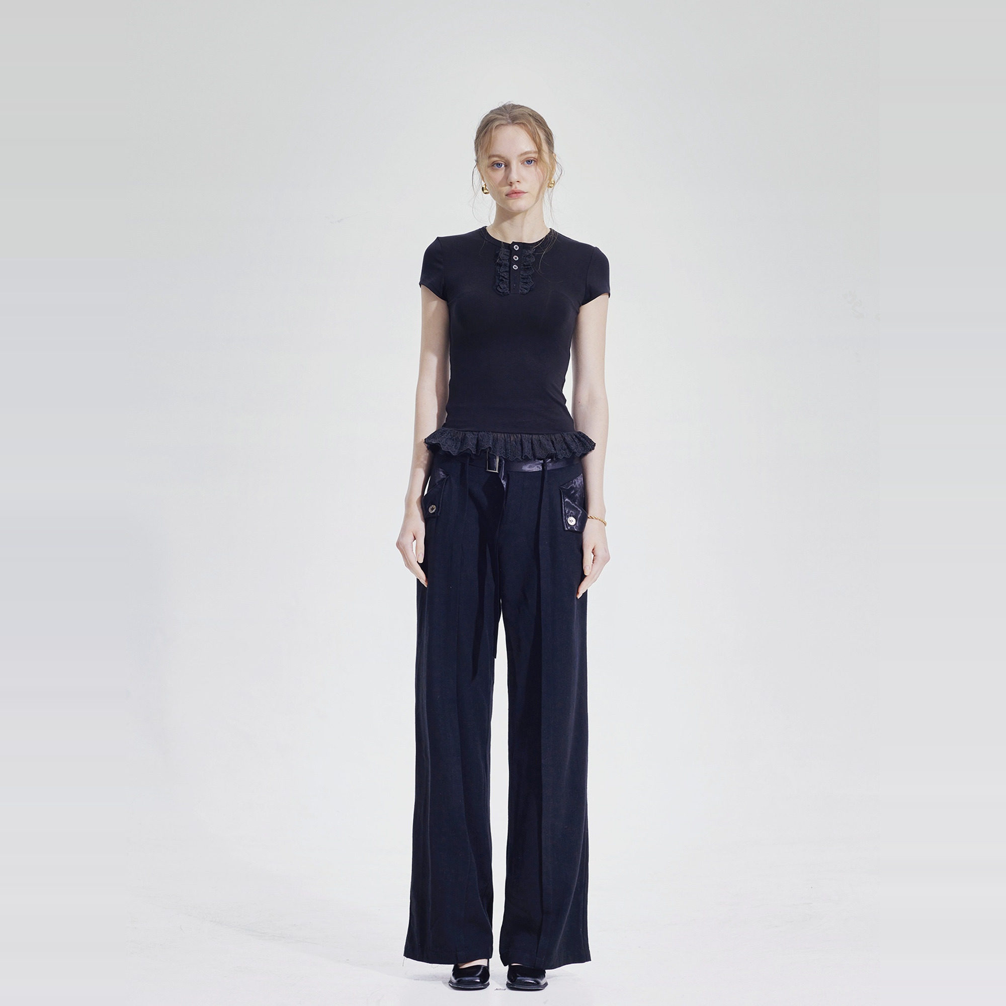 花纱海岛棉蕾丝亨利领拼接短袖 天鹅谷 T恤 TUAS TAM