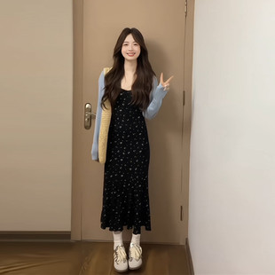 韩系小个子穿搭鱼尾长裙 女夏2026新款 法式 复古碎花吊带连衣裙套装