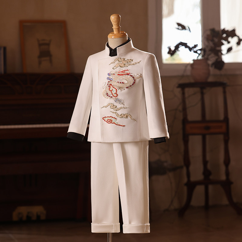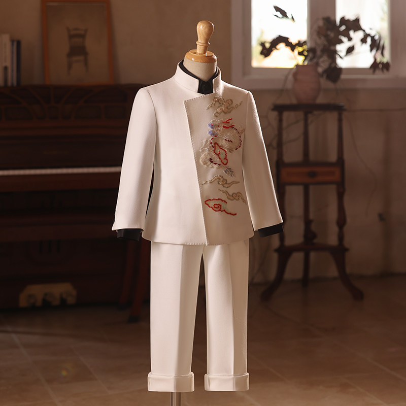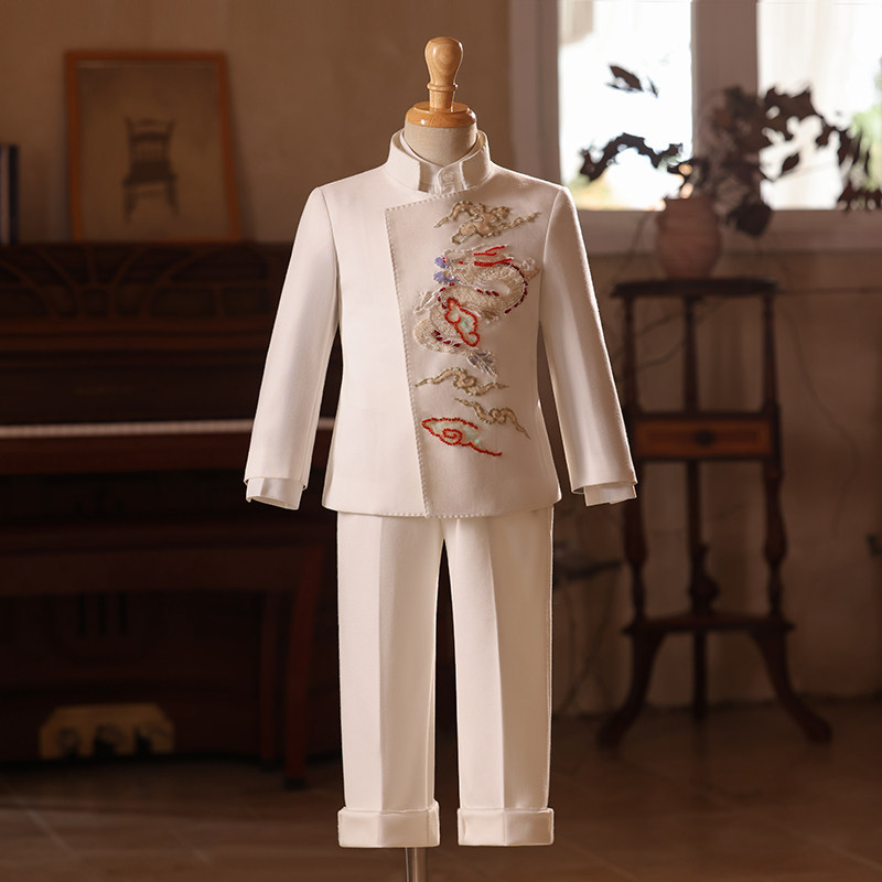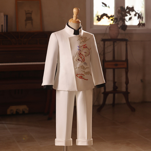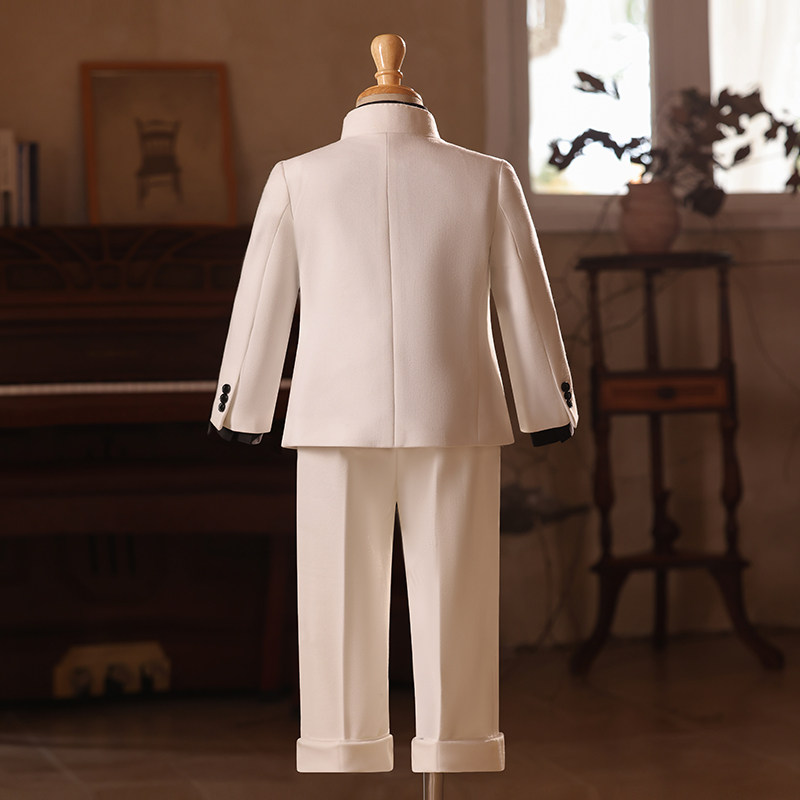 中国风主持人走秀比赛钢琴演出服 男童礼服白色新中式 儿童西装 套装