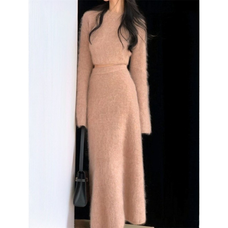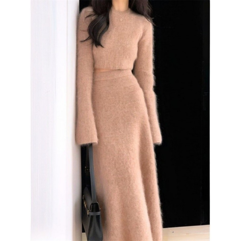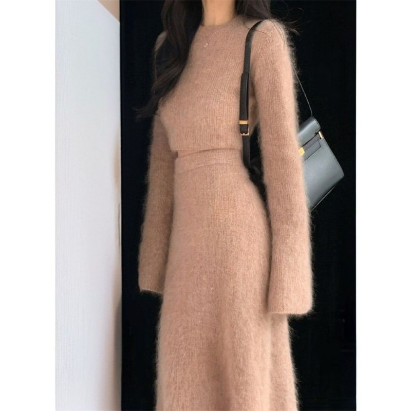 白色毛衣裙连衣裙女秋冬季 针织长裙打底内搭配大衣两件套裙子 套装