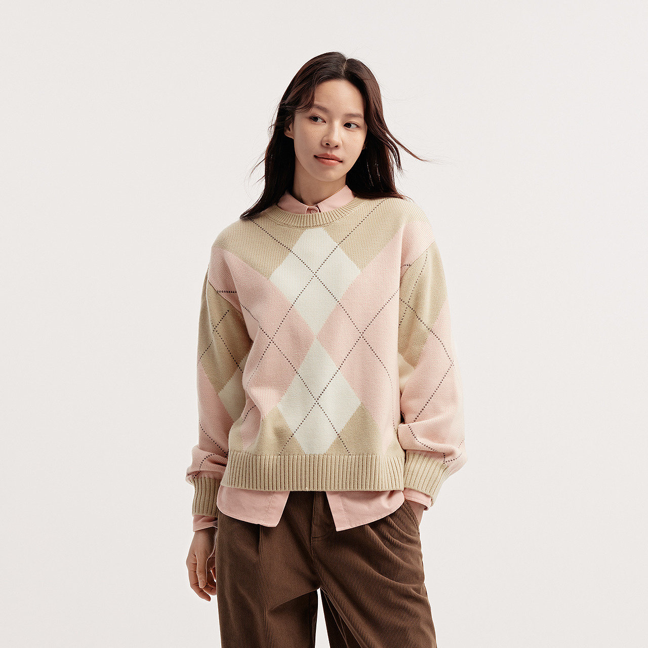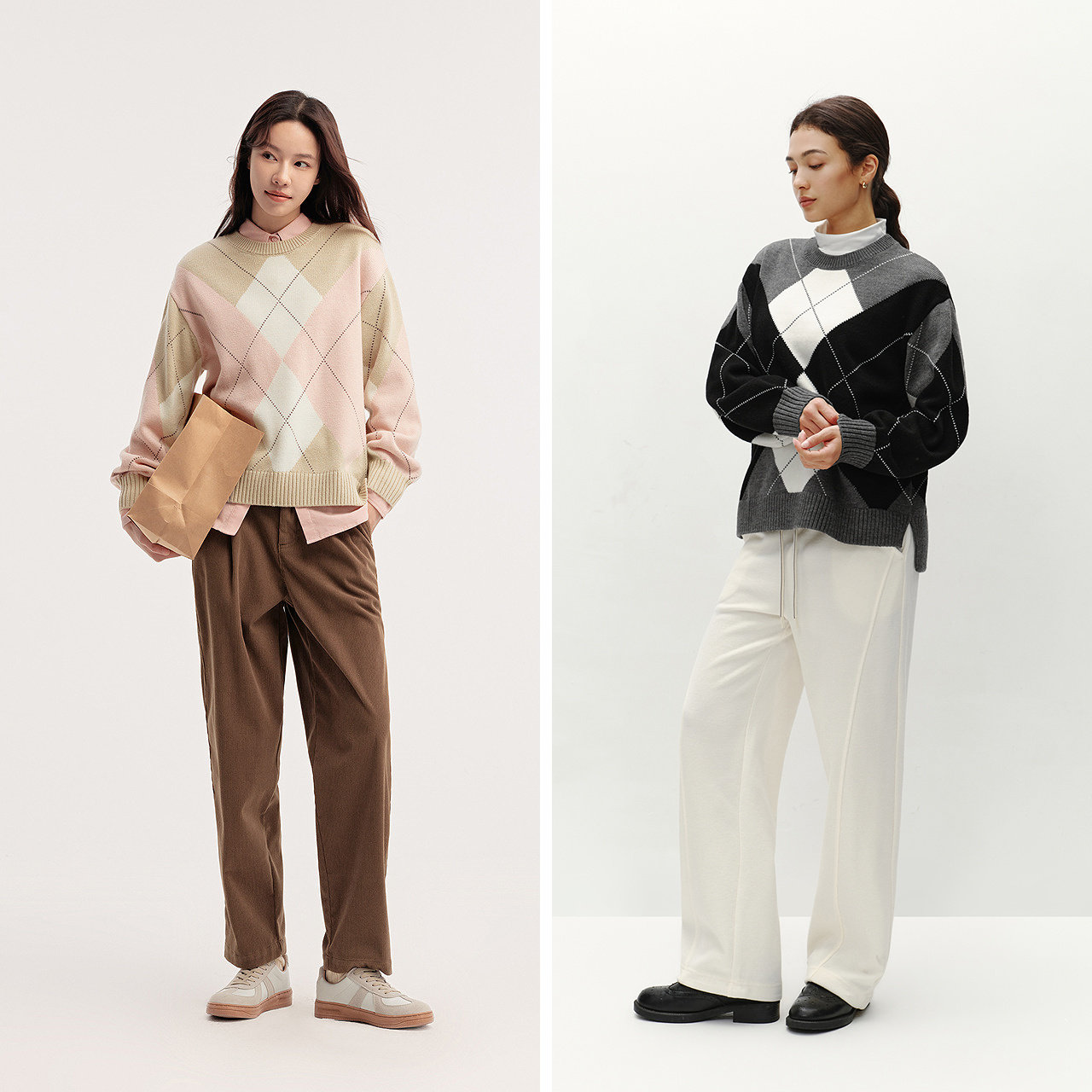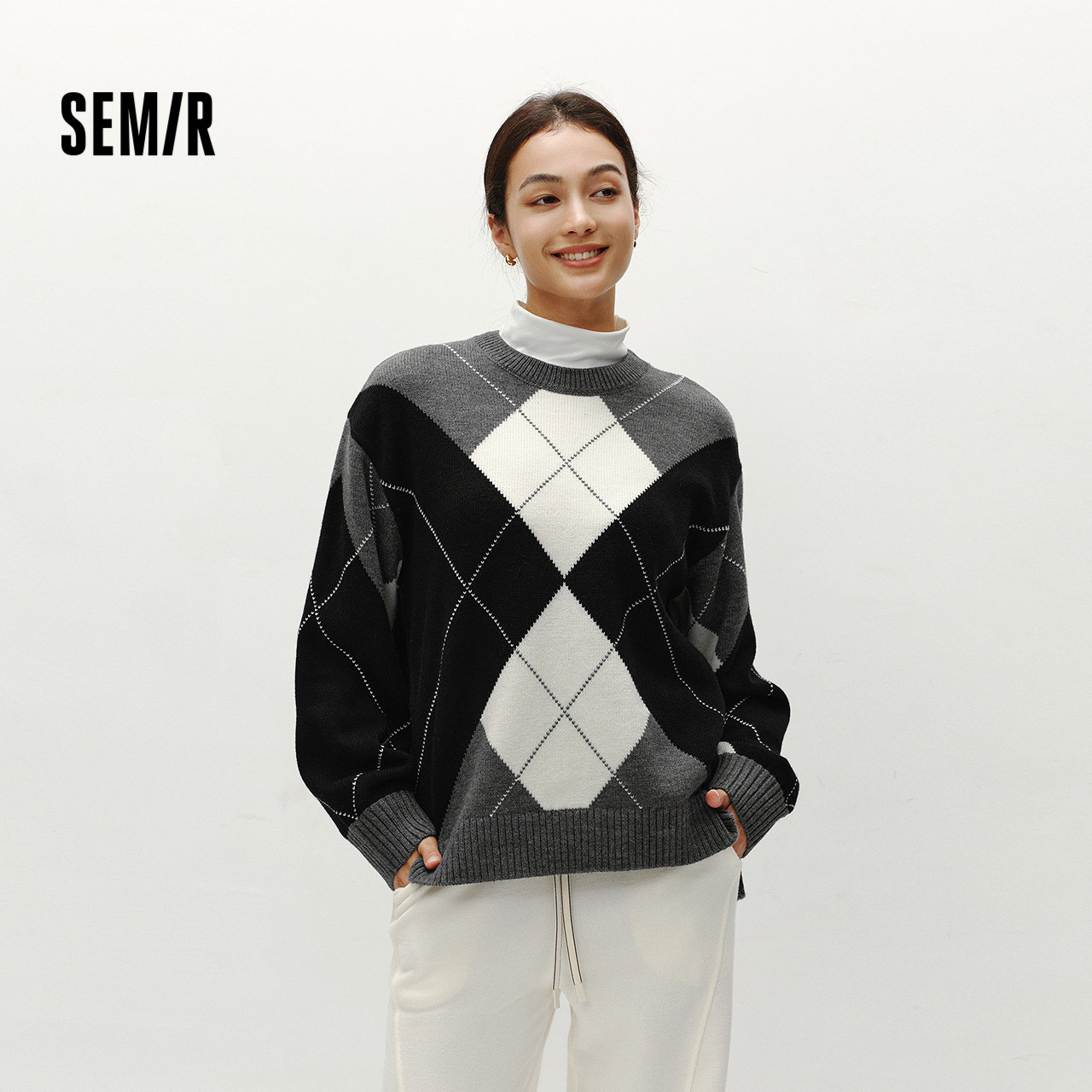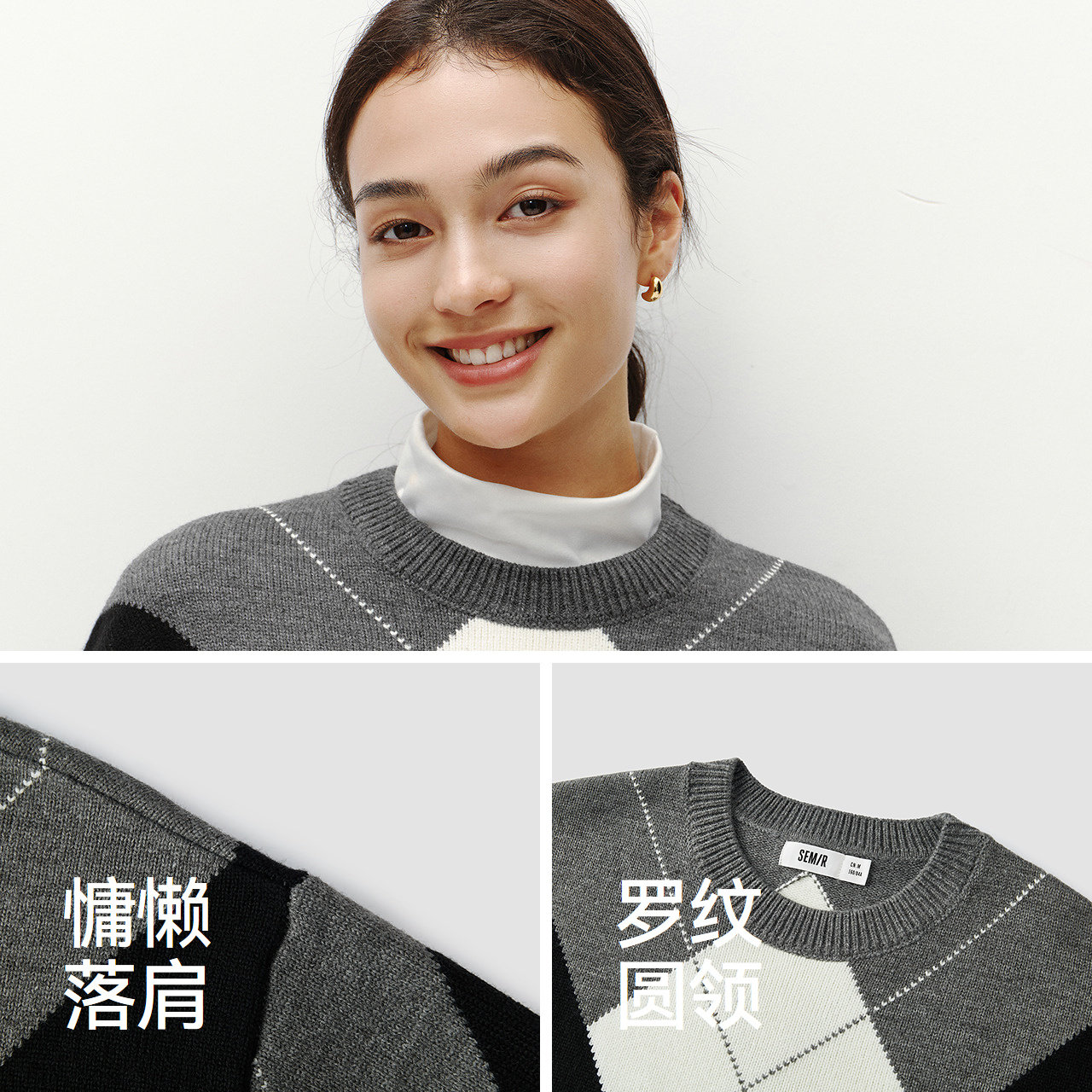 慵懒学院风毛衫 森柔 森马毛衣女冬菱形格撞色落肩圆领宽松套头衫