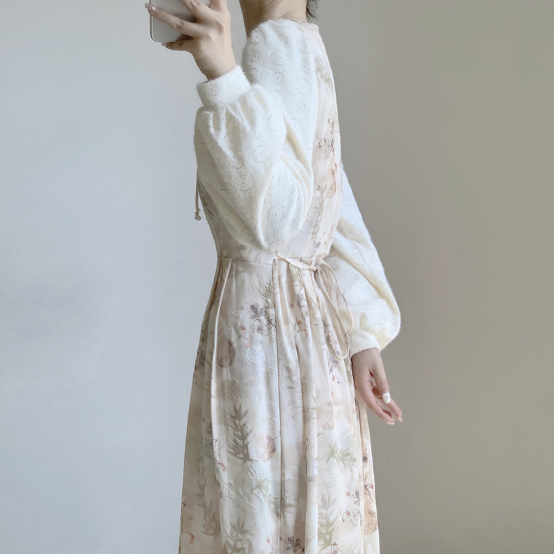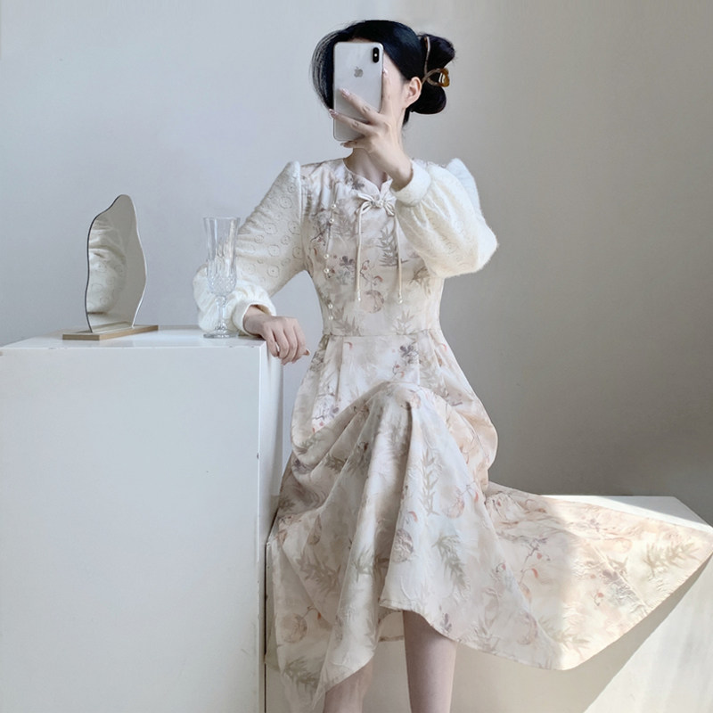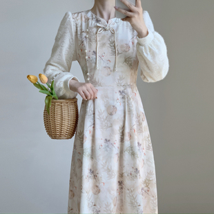 新中式 配大衣内搭打底裙 国风气质盘扣假两件碎花连衣裙女秋冬新款