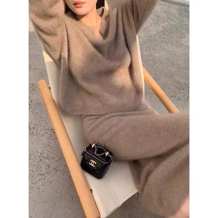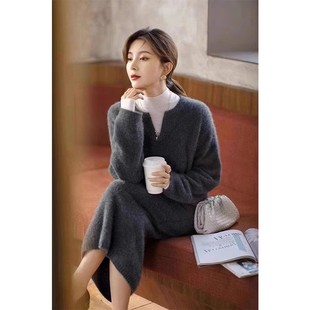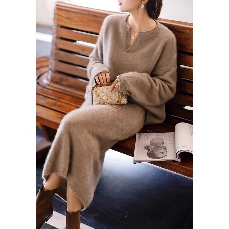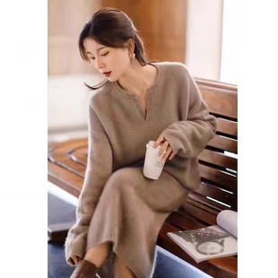 高级感100%纯羊毛套裙女两件套V领慵懒风宽松毛衣时尚 过膝半身裙
