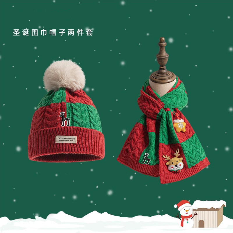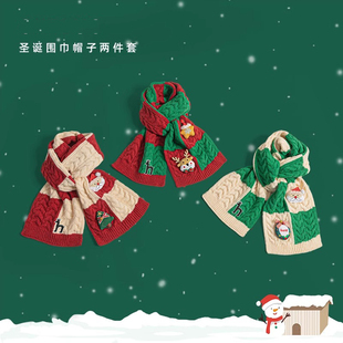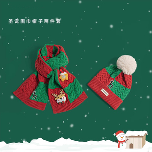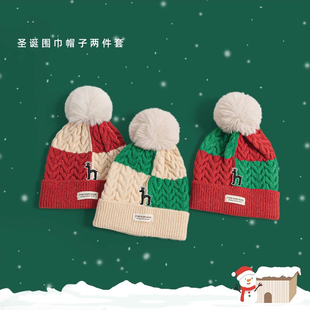 女童拼色毛线帽 新款 哈吉斯船长圣诞节儿童帽子围巾两件套装 秋冬季