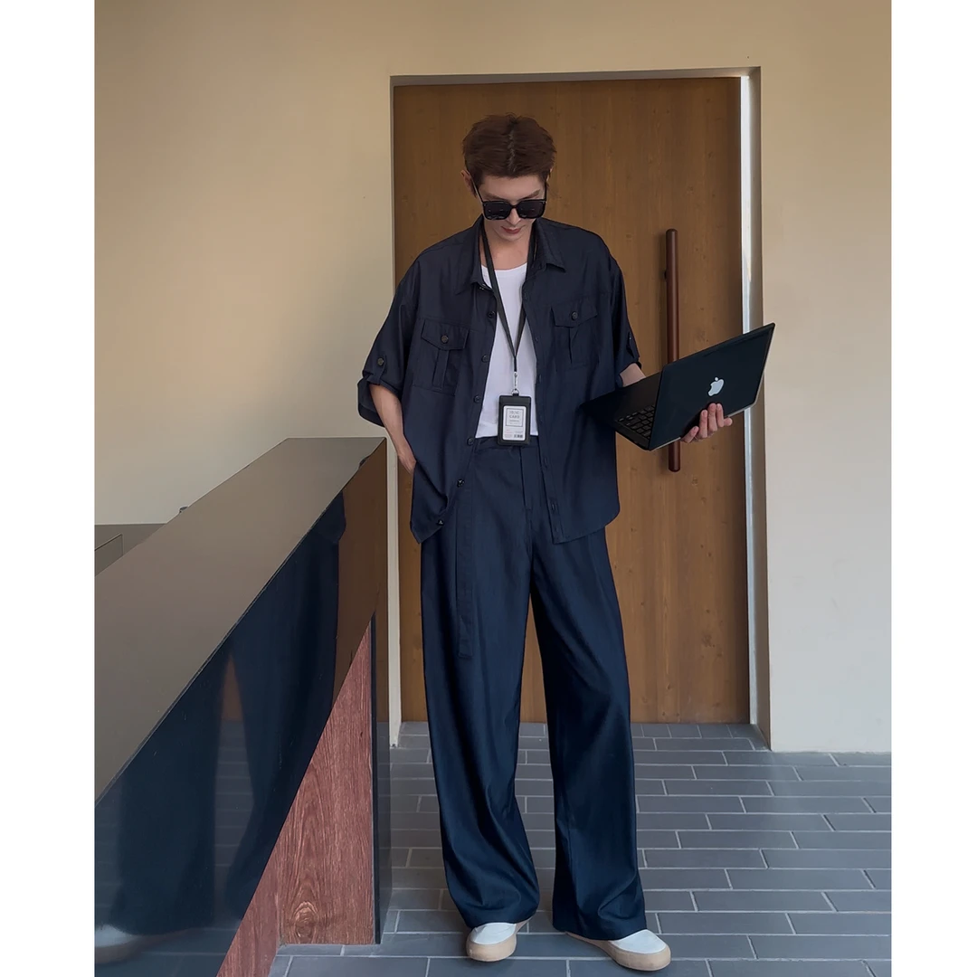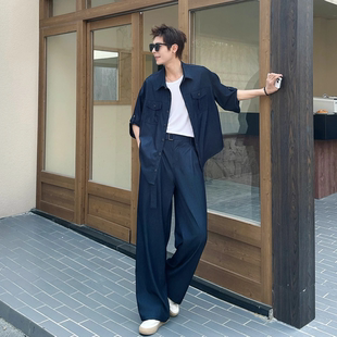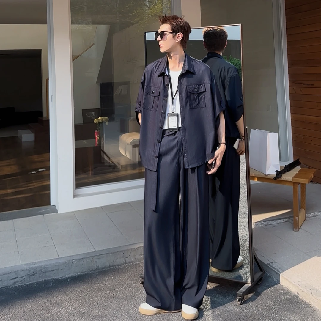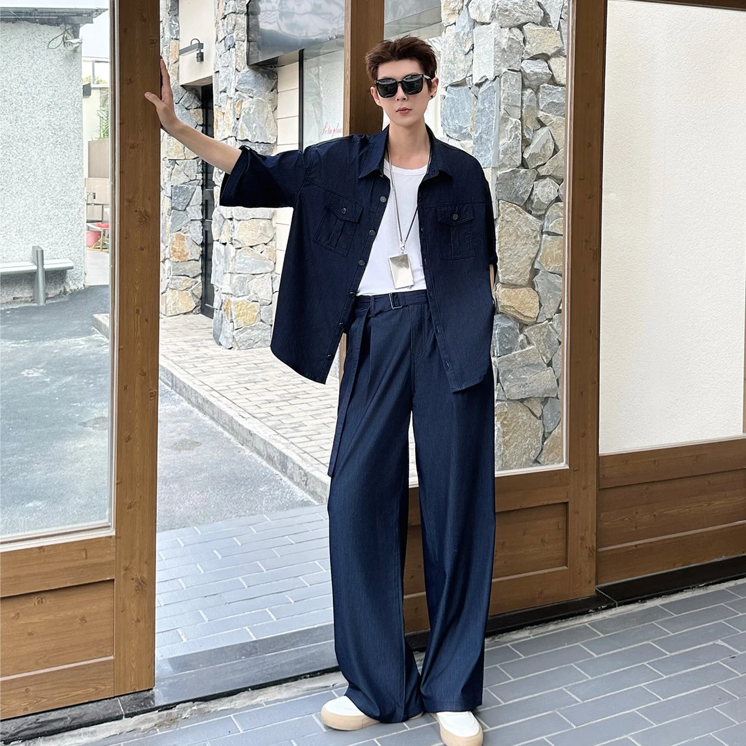 男款 痞帅衬衫 短袖 秋季 两件套气质韩版 潮流套装 宽松牛仔休闲裤 新款