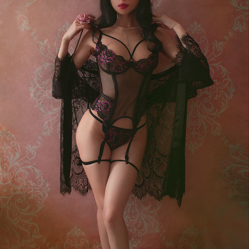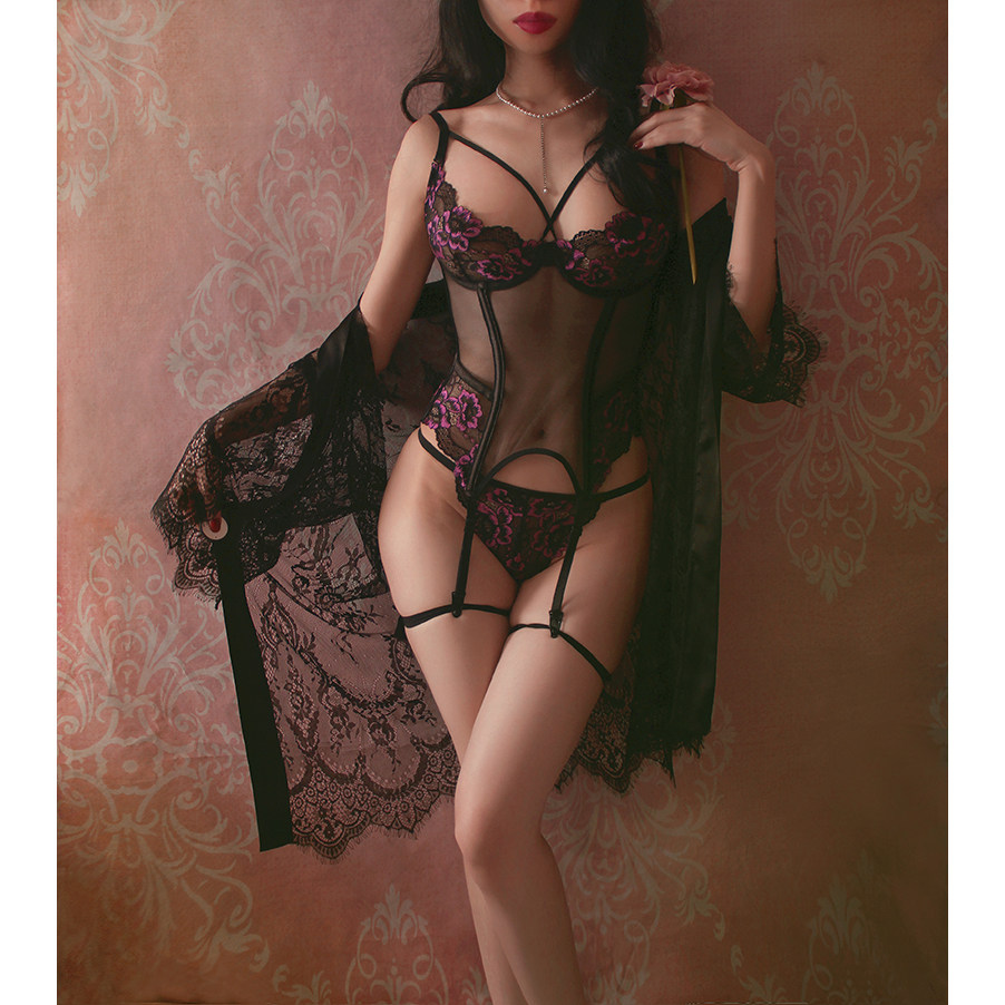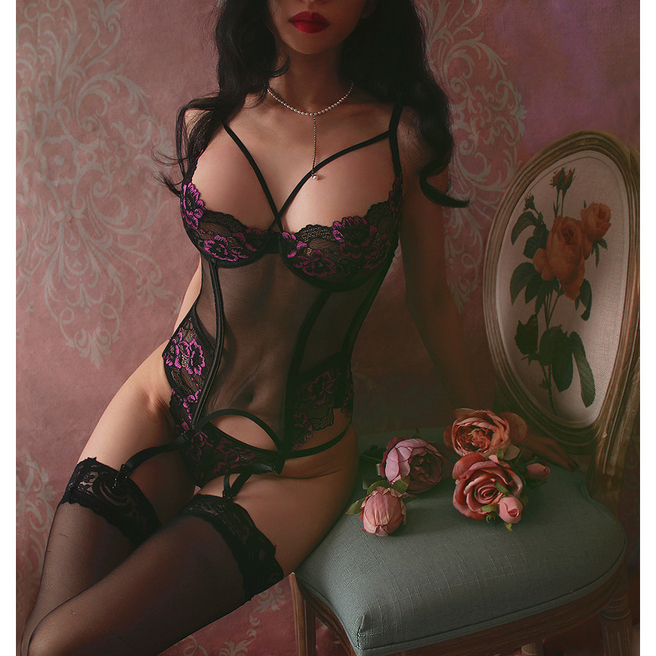套装 有钢圈鱼骨吊袜带塑身衣束身束腰衣T裤 赠丝袜 花欲放 幸己