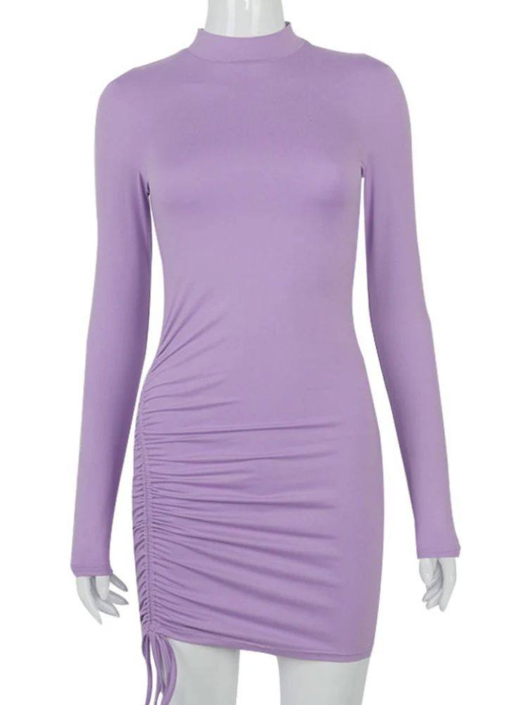 Bodycon Ruched Dress Women Bandage Long Turtleneck Sleeve