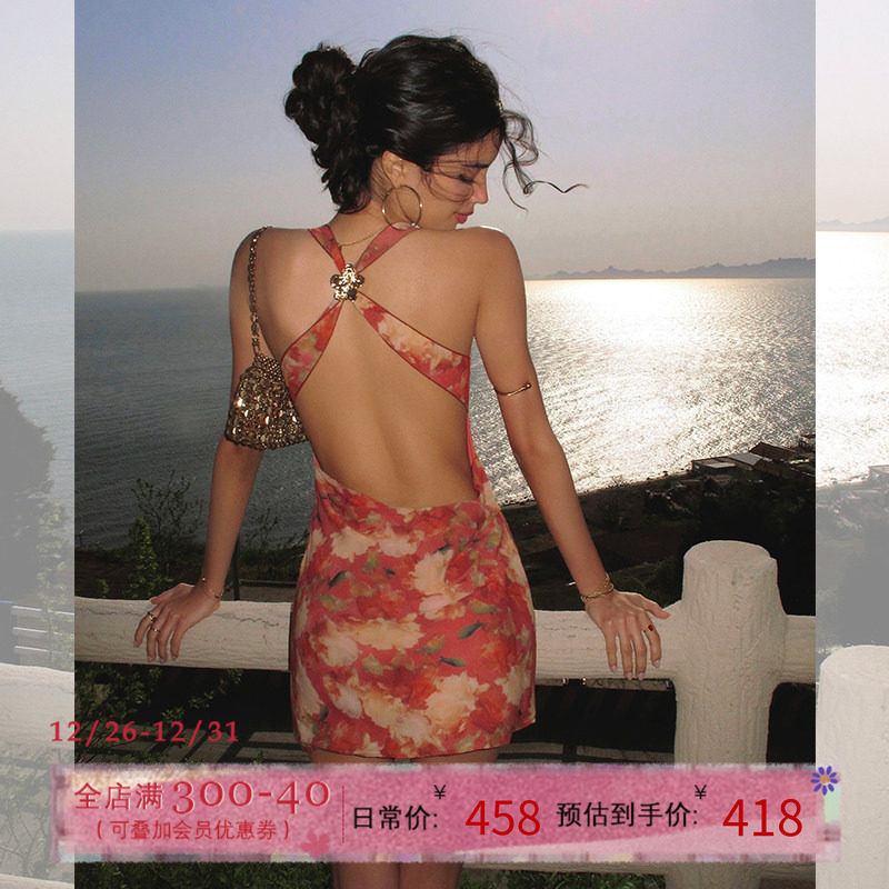 ITSNIKAR复古红色碎花连衣裙女性感挂脖吊带裙海边露背度假长裙子