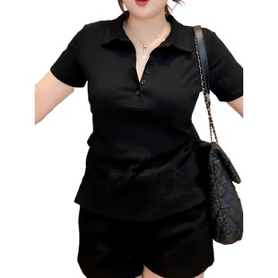 女装 修身 胖mm辣妹开叉polo领短袖 新款 显瘦休闲上衣潮 t恤夏季 大码