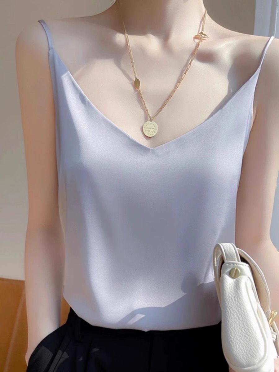 重磅真丝吊带背心女夏宽松无袖 桑蚕丝缎面上衣t恤 v领性感内搭无袖