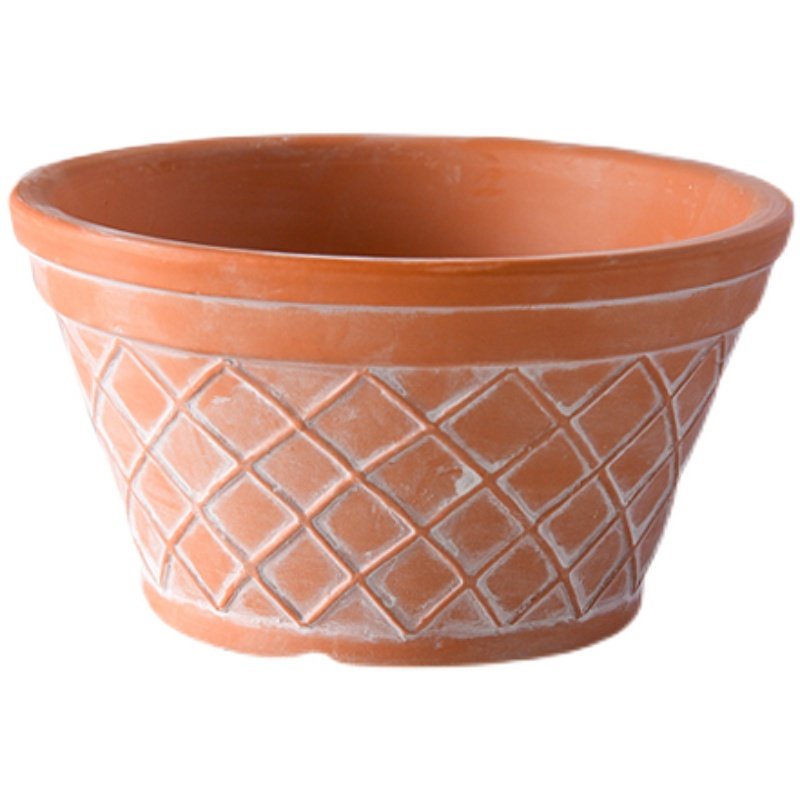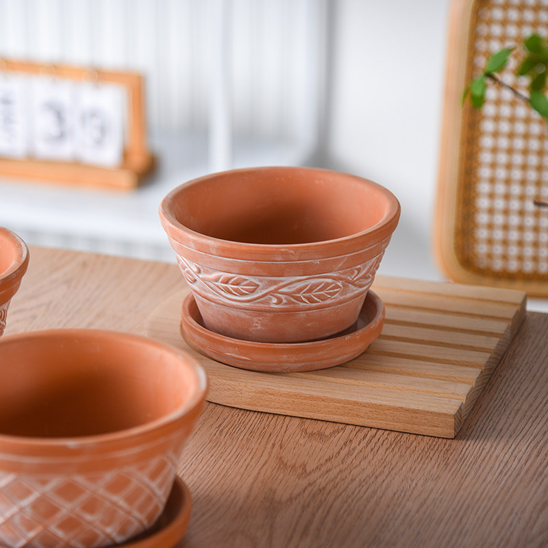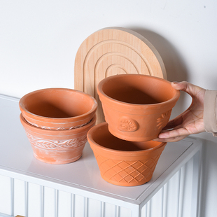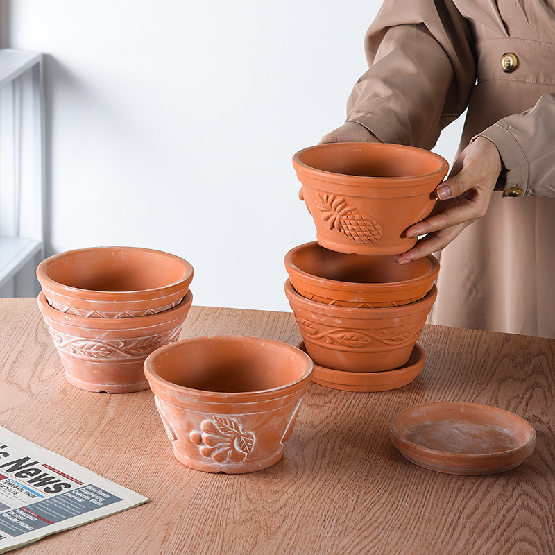 清仓圆形矮款 水果浮雕红陶花盆多肉植物透气粗陶土陶瓷花盆带托盘