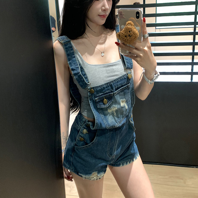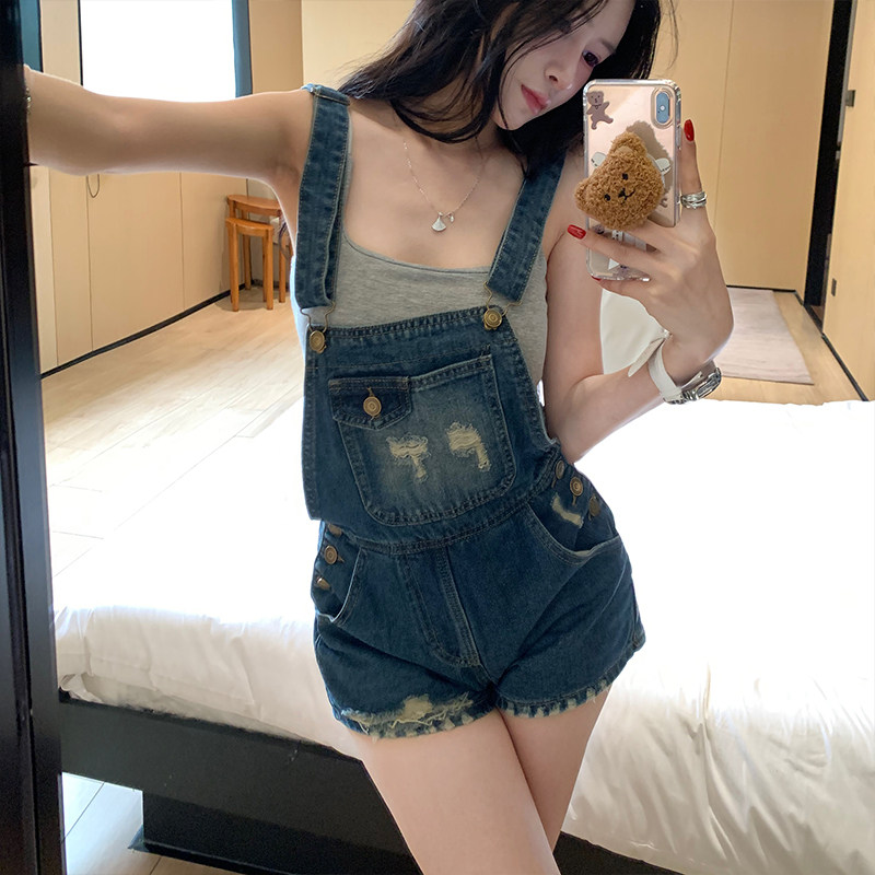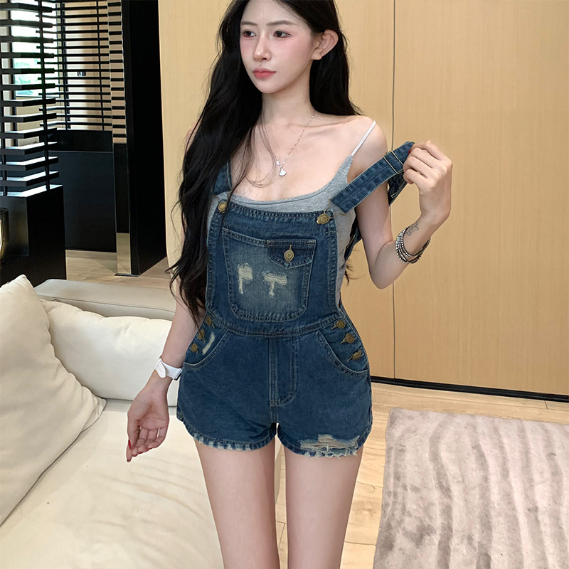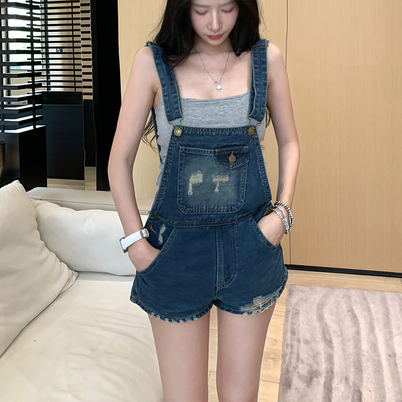 做旧显瘦连体短裤 女2026年夏季 破洞牛仔背带短裤 李李服饰甜辣美式