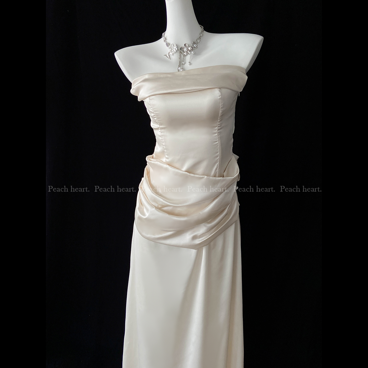 缎面温柔褶皱修身 法式 heart 抹胸小礼裙伴娘裙轻礼服女 Peach
